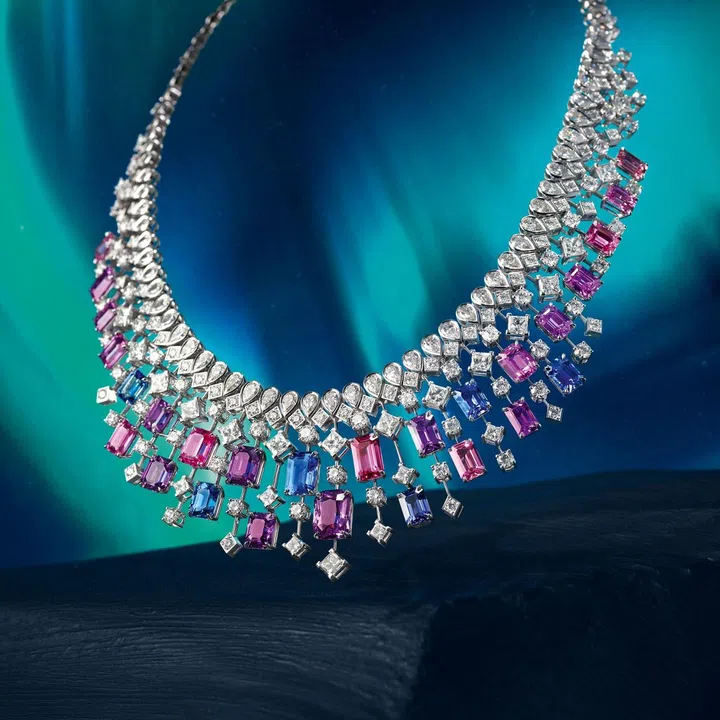 另外一款系列重点作品焦点:朦胧暮光 Gloaming Illuminations 主题珠宝,以瑰粉、鸢紫和夜蓝三种颜色的蓝宝石,来描摹夜空中的光色不断变化的动人姿态。不同颜色的宝石在夜幕中盘旋舞动,使天空宛如绚丽的画布,令人心醉神迷。