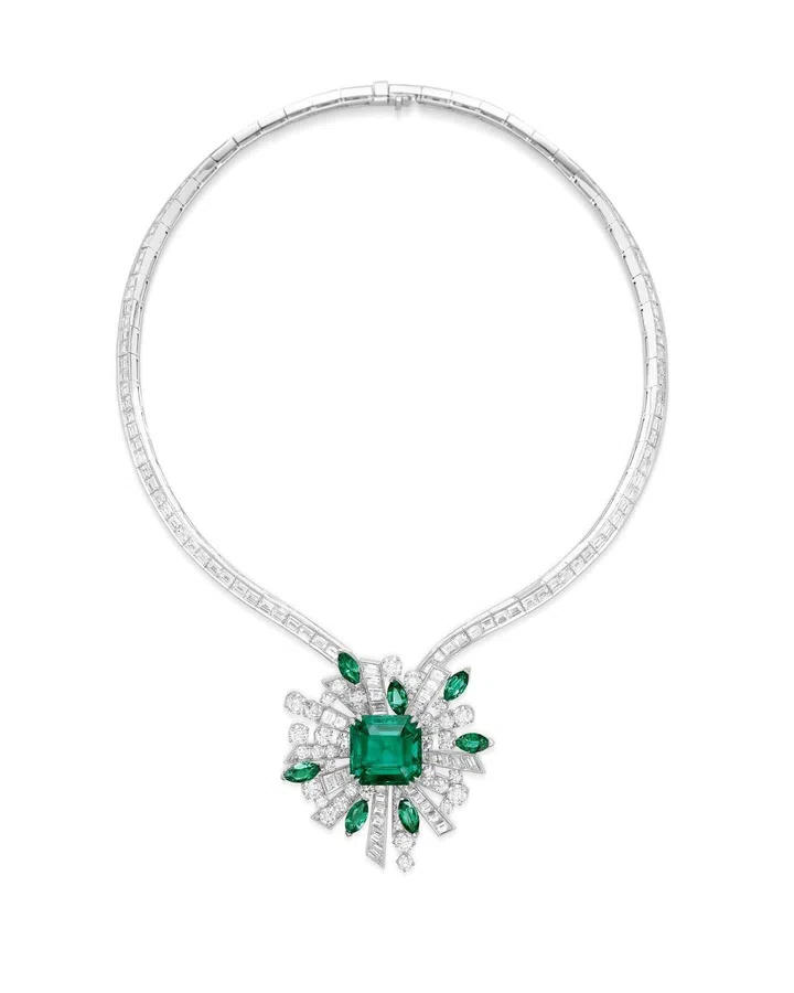 在第二篇章奇幻光影 Magical Lights 中,则将场景移至遥远北国,随着自然之光缓缓升起,天空变为斑斓浪漫的剧场,一场灯光秀即将拉开帷幕。在太阳风的驱动下, 北极光静默地穿过大气层,将不同形态的色彩投射到空中,反复变幻,呈现宛如万花筒般的璀璨极光。 魔幻极光Magical Aurora主题珠宝作品汇聚了极地美景的奇妙能量,熠熠光芒展现极光奔驰于夜幕的盛景。 像是魔幻极光主题项链,中央便镶饰一颗产自哥伦比亚的珍罕 16.84克拉祖母绿, 纯净的质地赋予宝石无穷活力和能量,亦是对自然之光的无上致敬。