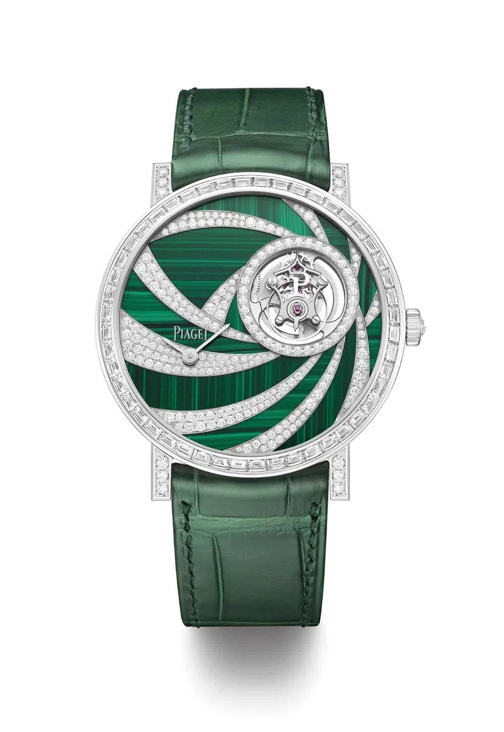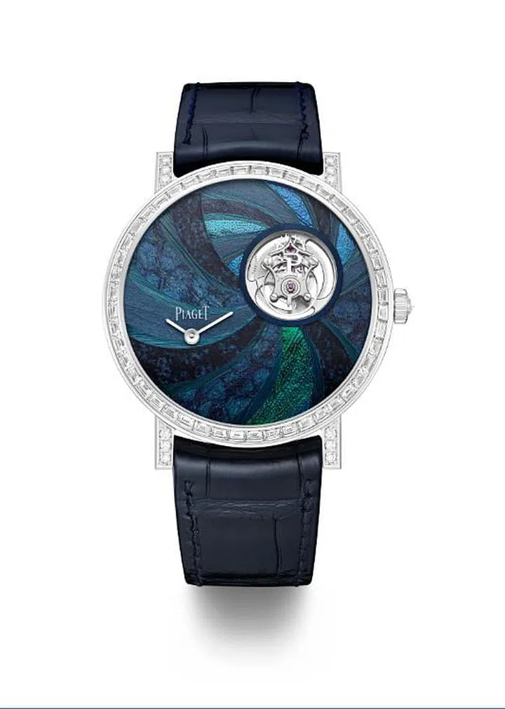 第三篇章Infinite Lights 永恒光境中,也有一款特别的星空之舞Celestial Dance主题腕表。伯爵再次邀请艺术家Rose Saneuil于表盘之上,运用精湛的宝石镶嵌工艺与精妙的设计, 再现夜空的绚丽美景,以此向美好回忆致敬。Rose Saneuil此次特别使用包含蓝色麦秆、皮革、羊皮纸、鞘翅和角木,凭借材质之间的差异塑造出奇幻的拼贴效果,每只腕表作品都需历时50多个小时才得以制作完成。其中的鞘翅,也是品牌首次使用昆虫羽翅来制作腕表面盘,同样也是搭载670P 飞行陀飞轮超薄机芯,全球限量8枚,非常珍贵。