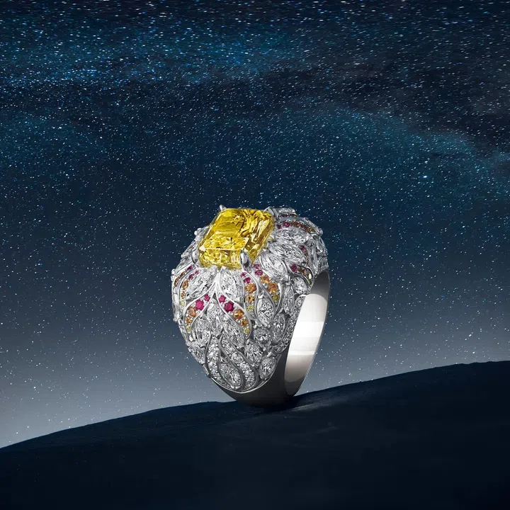 Extraordinary Light系列非凡光景艳彩黄钻顶级珠宝戒指,18K白金镶嵌枕形切割艳彩黄钻主石重约5.54克拉、17颗圆形明亮式切割黄钻,总重约0.07ct、24颗圆形切割锰铝榴石,总重约0.32ct、35颗圆形切割尖晶石,总重约0.24ct、46颗榄尖形切割美钻,总重约4.90cts、48颗圆形明亮式切割美钻,总重约0.57ct。