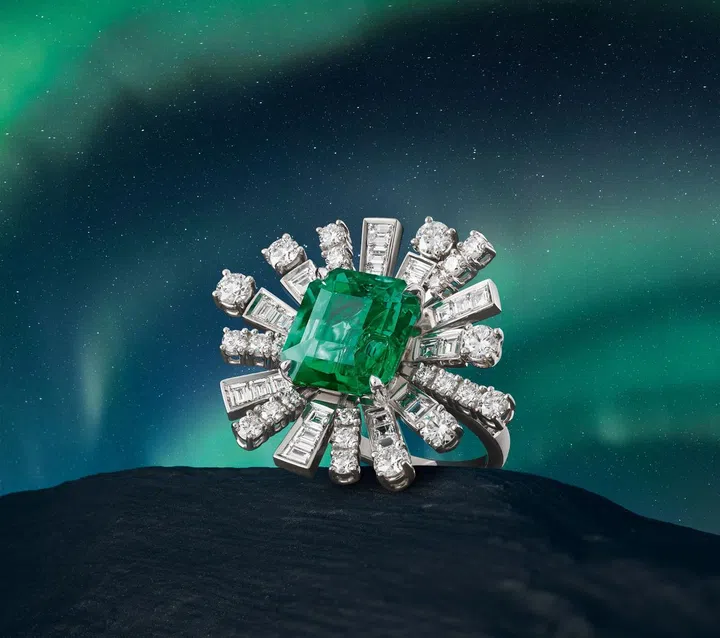 此外,魔幻极光Magical Aurora主题戒指和耳环,同样也是采用来自哥伦比亚的祖母绿,其殷绿色泽勾勒出自然极光的神秘之美,令人神往。