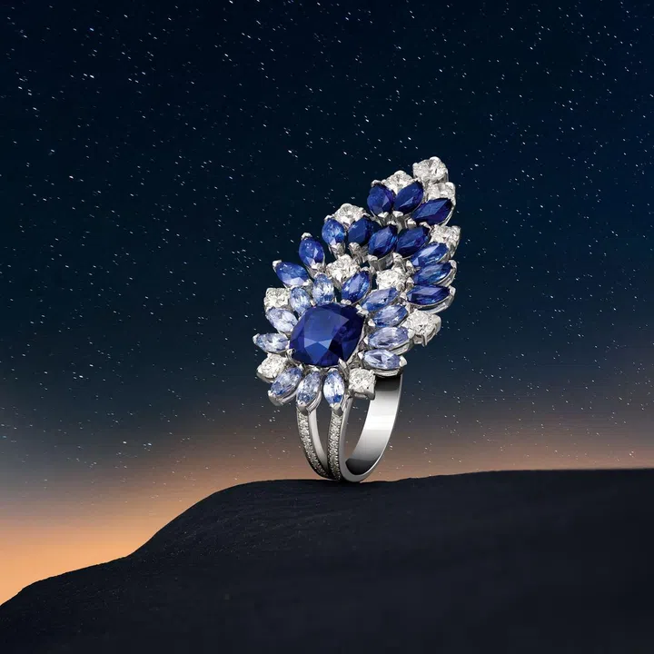 Extraordinary Light系列星空之舞蓝宝石顶级珠宝戒指,18K白金、主石为枕形切割斯里兰卡蓝宝石重约3.71克拉、24颗榄尖形切割蓝宝石总重约6.03克拉、圆形明亮式切割美钻。