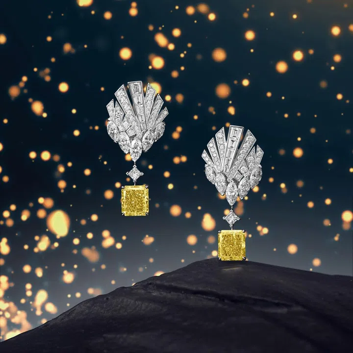 Extraordinary Light 系列幸福光芒浓彩黄钻顶级珠宝耳环,18K白金镶嵌1颗主石为雷地恩形切割浓彩黄钻重约3.02克拉、1颗雷地恩形切割浓彩黄钻主石重约3.11克拉,及榄尖形切割、长方形、公主方形及圆形美钻圆形明亮式切割美钻。