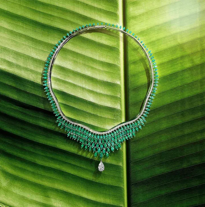 18K铂金项链镶嵌单颗梨形切割钻石(约重3.01克拉)、177颗马眼形切割祖母绿宝石(约重48.44克拉)及172颗圆形美钻(约重7.17克拉)。