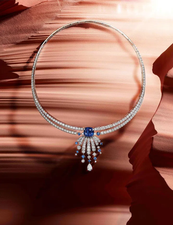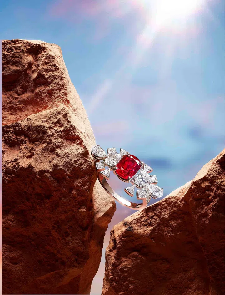 Desert Minerals (旷漠之珍),以强烈浓郁的色彩、匠心独运的设计以及细致繁复的形态,深情咏叹原始生命的纯粹无暇。这是一段讲述生命源流的故事,所有珍贵的钻石、红宝石和蓝宝石都成为珠宝艺术创作当中呼应主题的主角。Desert Minerals更展现出自然之景的变化更迭,笼罩在阳光中的岩石和泛起阵阵涟漪的清澈湖水,为这烈日炎炎增添一丝清凉怡人。