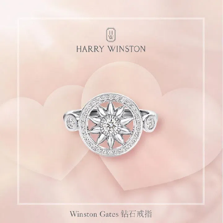 指尖的圆满,温暖了彼此的心。海瑞温斯顿(Harry Winston)Winston Gates系列钻石戒指以明亮式切工钻石周围环绕着一圈密钉镶嵌钻石,犹如一道幸福光环。