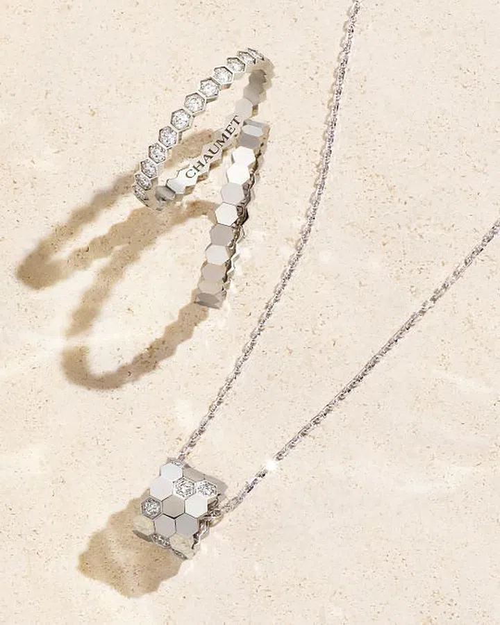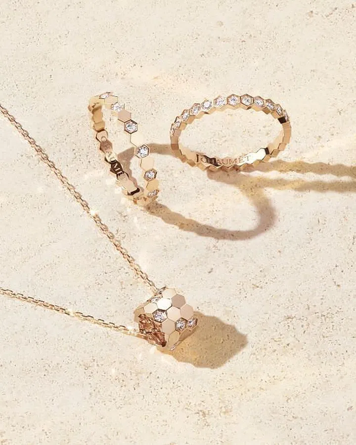 浪漫之际,光芒“蜂” 拥而至。用尚美巴黎(Chaumet)Bee My Love爱·巢系列新作传递七夕“蜜”语。由崭新的现代性视角重塑拿破仑的幸运图腾“蜜蜂”,将“蜂巢”堆叠相契,化为呈现摩登美感的Bee My Love爱·巢项链和戒指,棱角勾勒独特魅力,告白浪漫爱意。白金或玫瑰金间缀以晶莹的钻石,闪耀无限魅力。
