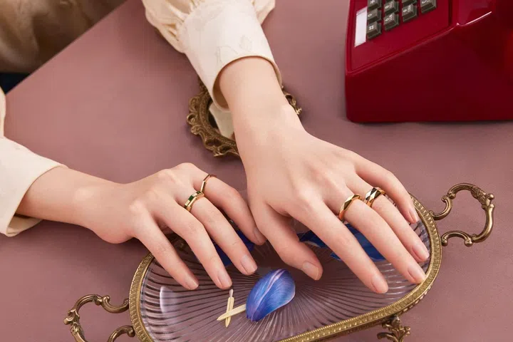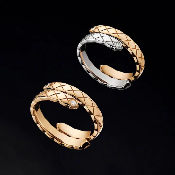 香奈儿(Chanel)Coco Crush珠宝系列作品灵感源于菱格纹图案,这一图案自1955年起便成为香奈儿的标志元素。全新Coco Crush Toi et Moi 戒指,以并行的设计,预示着命运的交汇。两条相遇的平行轨迹,象征着爱与自由。香奈儿品牌形象大使刘雯在宣传照中佩戴标准款Coco Crush Toi et Moi 米色K金镶钻戒指,白K金与米色K金镶钻戒指,与米色K金镶钻项链。