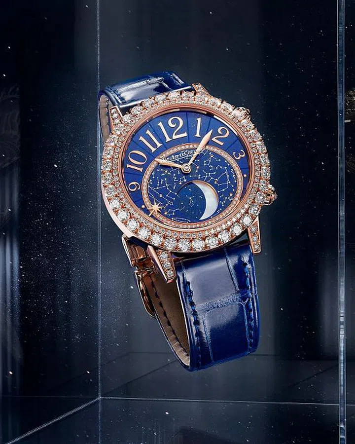 Rendez-Vous约会系列是致献女性魅力的一曲颂歌,为积家(Jaeger-LeCoultre)制表大师和工艺大师带来源源不断的灵感。2021年,积家继续向女性致敬,推出全新Rendez-Vous Dazzling Moon Lazura约会系列月相珠宝腕表。此款腕表以熠熠生辉的全新方式演绎大型月相显示,融汇高级制表与高级珠宝经典元素,赞颂浪漫星夜。璀璨闪耀的钻石映衬湛蓝的青金石,柔和温暖的玫瑰金与温润莹亮的珍珠母贝相辅相成。表盘上半部分镶贴Rendez-Vous约会系列别具特色的“花体”数字时标,其大小呈现渐变造型,构成一道宽阔半弧。表盘边缘镶嵌象征Rendez-Vous约会系列的手工抛光金色星辰,可通过位于表壳侧面2时位置的第二枚表冠调校,以指示特定的约会时间。