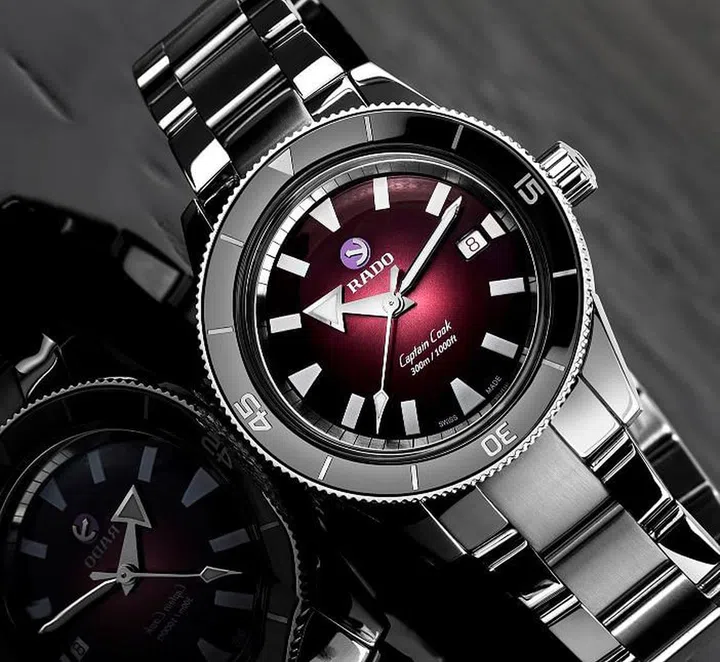 运动型的Captain Cook 库克船长系列腕表,表盘为由内而外呈现出从深红至黑色的渐变色。外缘的黑色,又由黑色高科技陶瓷可旋转表圈所承接。搭配醒目的三连排精钢表链,展现阳刚风范。