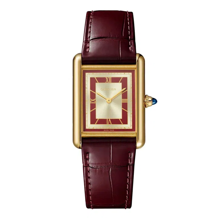 卡地亚(Cartier)Tank Louis Cartier 腕表,从1980年代的历史表款中汲取灵感,通过醒目的色块元素衬托Tank腕表简约的线条,致敬Louis Cartier的经典设计。表盘缀以罗马数字和金色分钟轨道,充满复古魅力。红色表款搭配黄K金,并配以同色调鳄鱼皮表带。