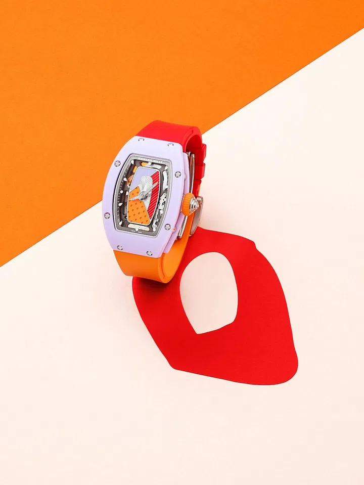 色彩上的冲撞对比,是此系列一大看点。TZP粉红色陶瓷表壳撞上了蔚蓝、丁香紫的橡胶表带;另一枚TZP粉紫色陶瓷表壳则和珊瑚红、橘色橡胶表带擦出动感火花;第三款的TZP粉蓝色陶瓷表壳则与橄榄绿、水绿色橡胶表带相映成趣,每一只腕表都像小女孩不小心在白色画布上泼洒了水彩颜料,意外展现出童心未泯的艺术天分。