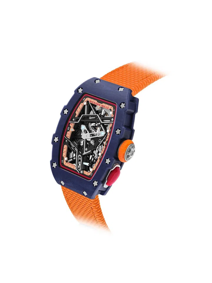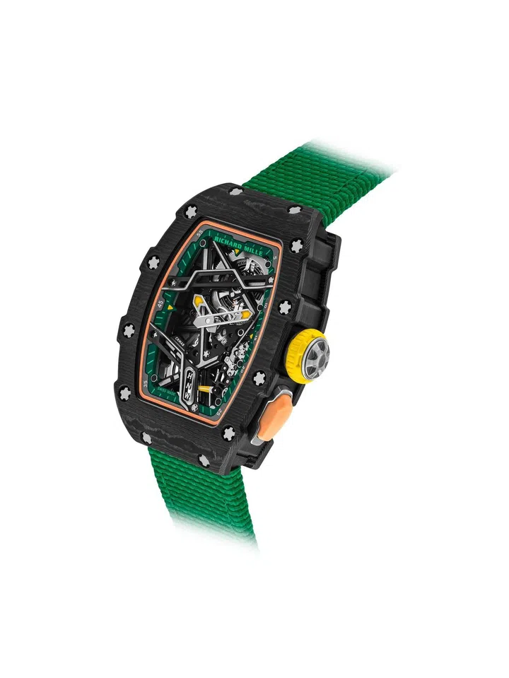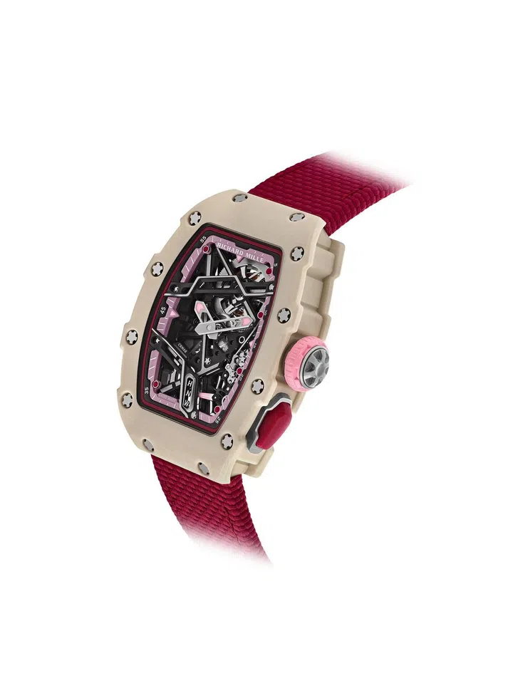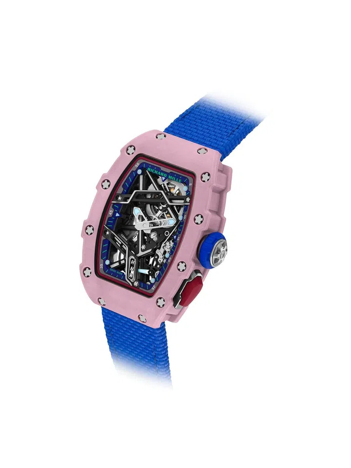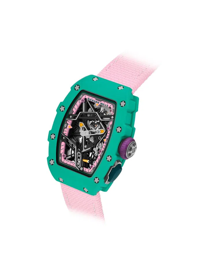 RM07-04 提供六种颜色和两种外壳材料;五只手表的石英 TPT 和一只手表的碳 TPT。后一种材料以黑色呈现,Quartz TPT 的颜色为乳白色、紫红色、鲑鱼色、绿色和深蓝色。每款腕表均配有对比鲜明的橡胶表冠和按钮。此外,在法兰、指针和小石上可以看到流行的颜色——所有这些都是 Richard Mille 签名的一部分。