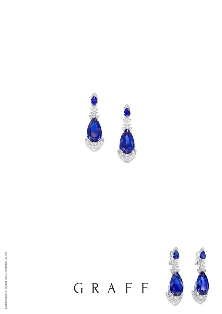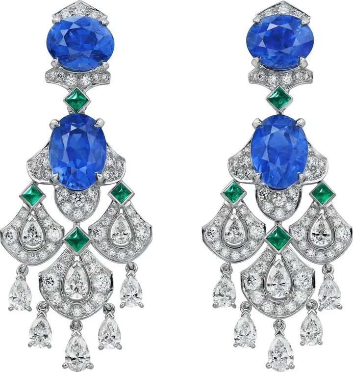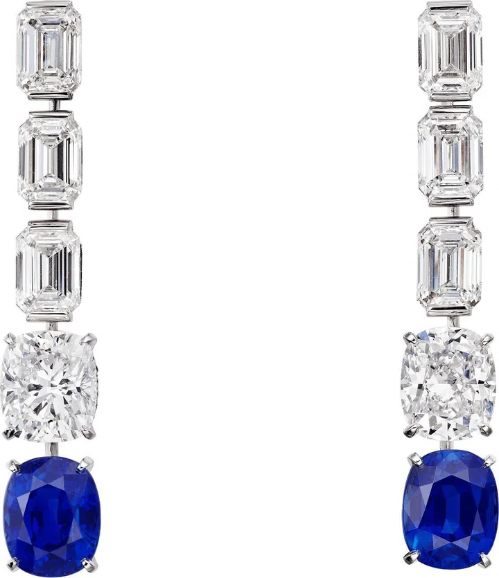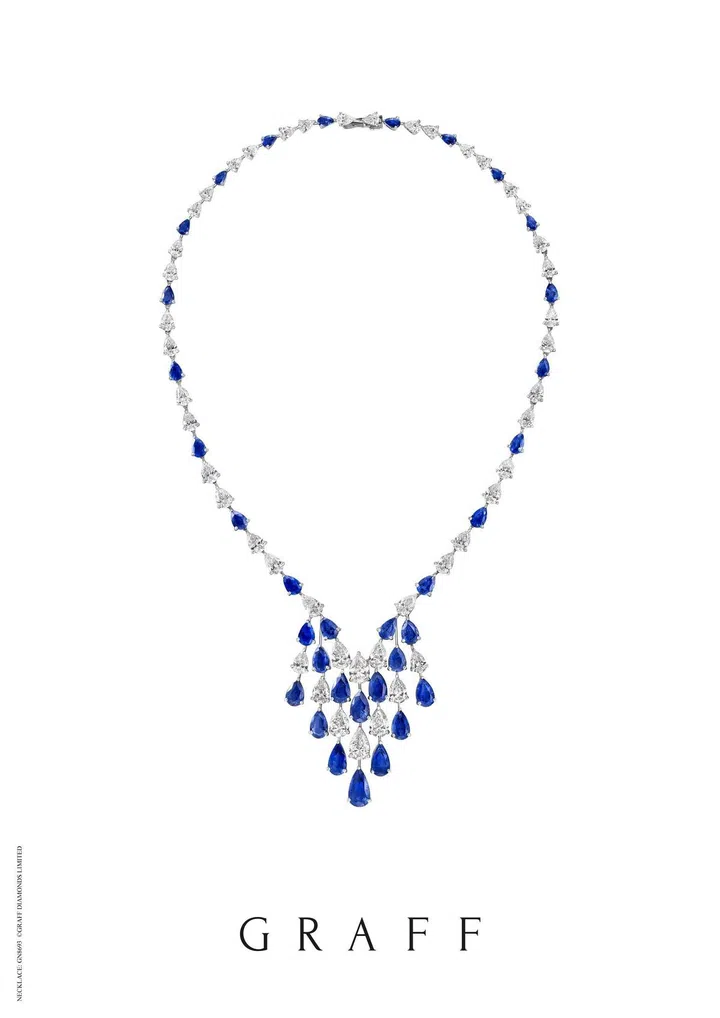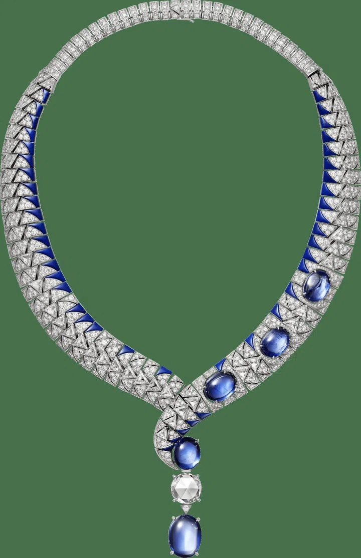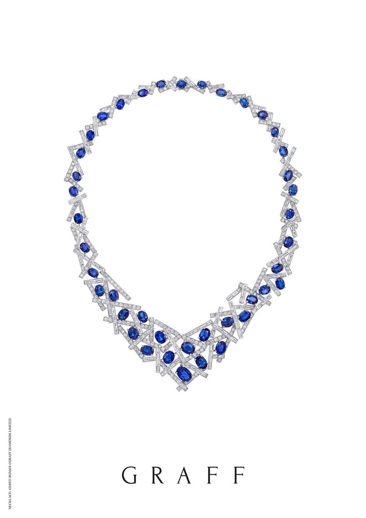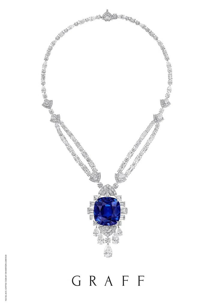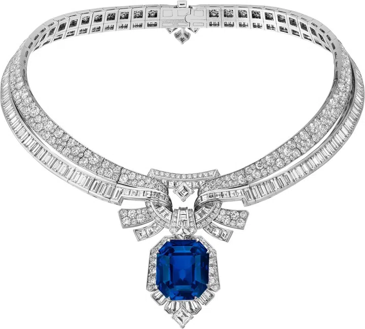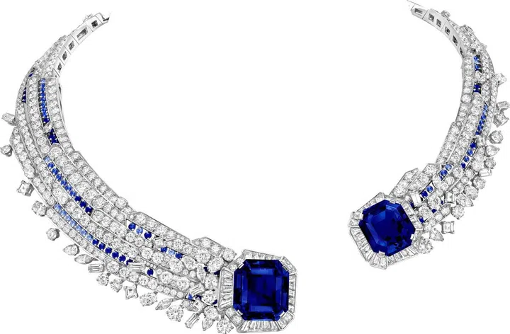 Sous les étoiles高级珠宝系列Trésor astral项链,18K白金镶嵌一颗重31.17克拉的八角型蓝宝石(产自斯里兰卡)、一颗重22.82克拉的八角型蓝宝石(产自缅甸)、蓝宝石及钻石/Van Cleef & Arpels。