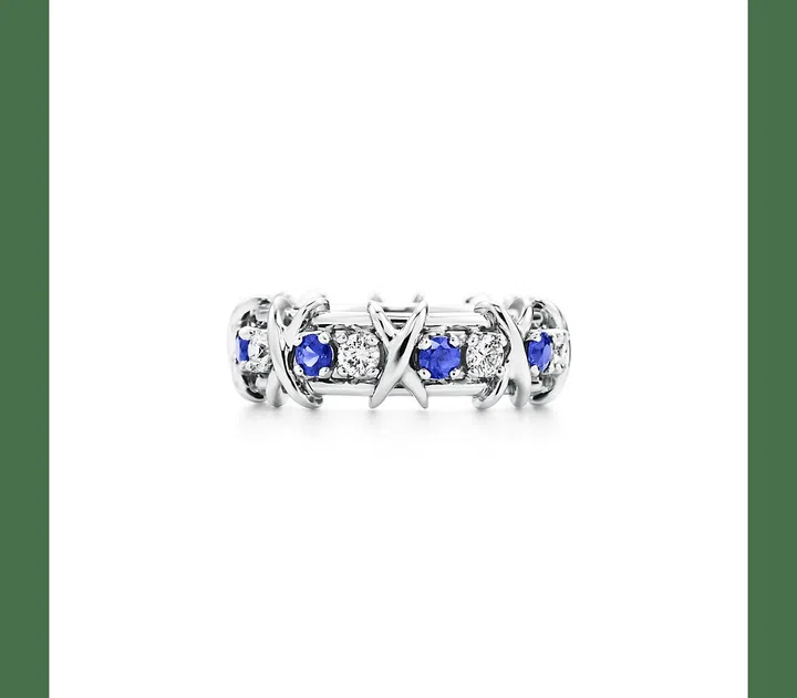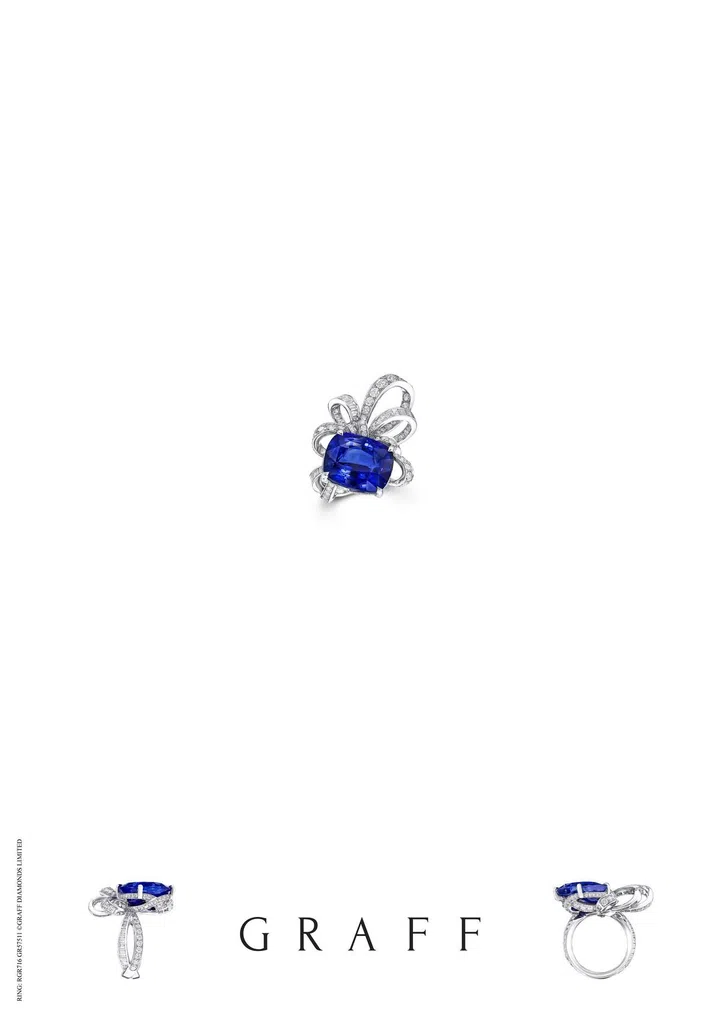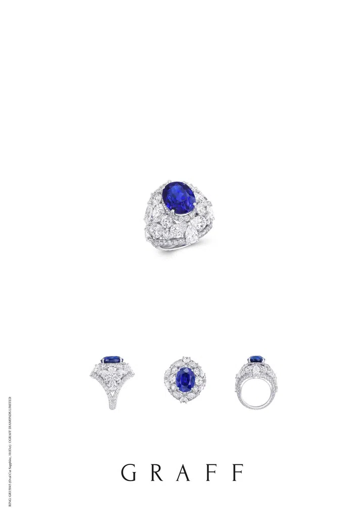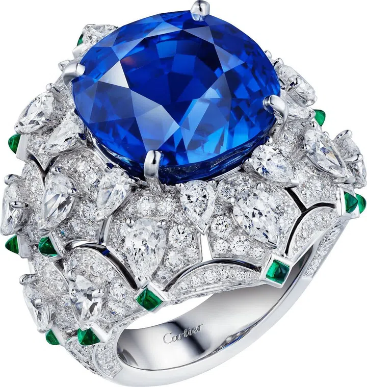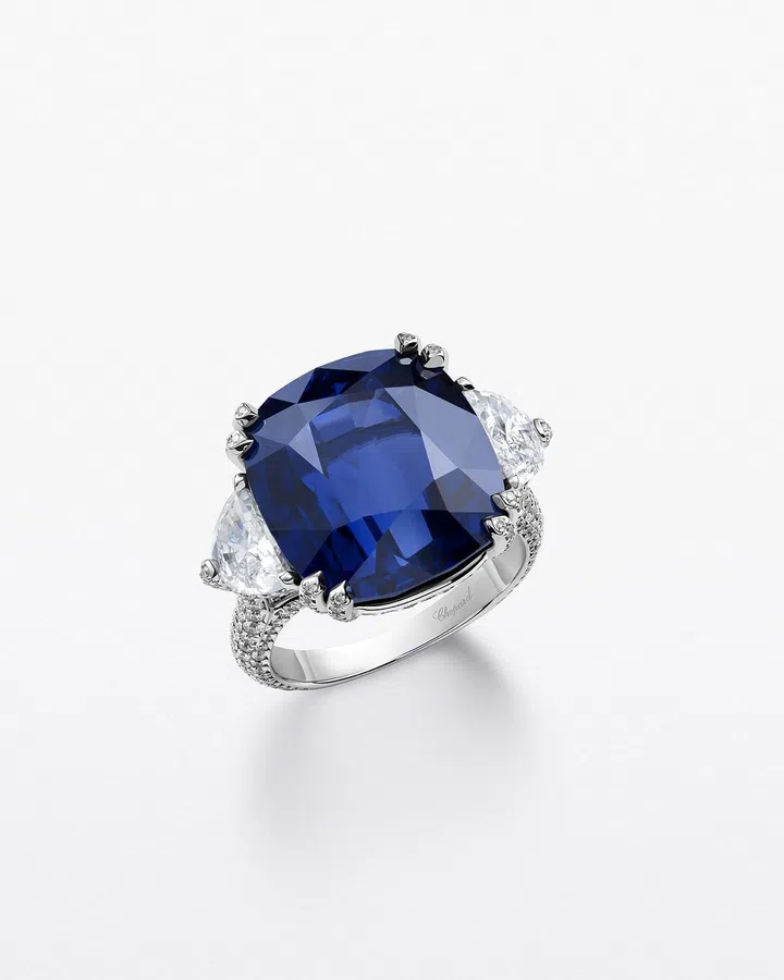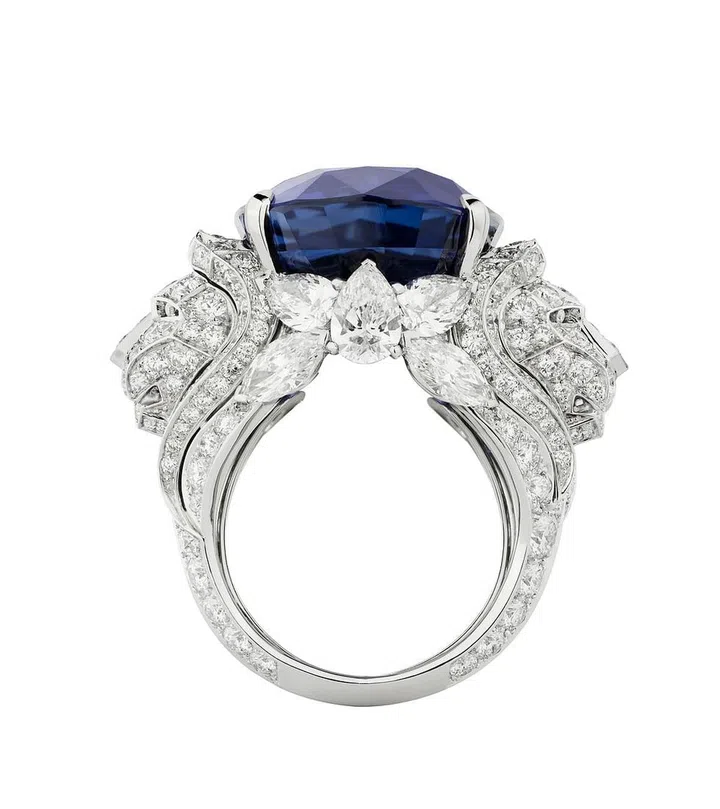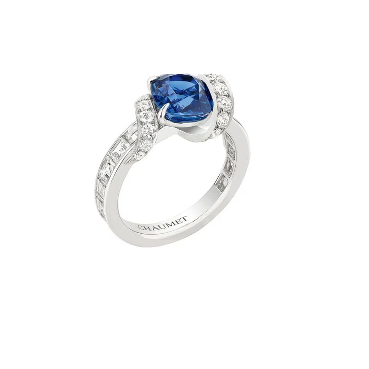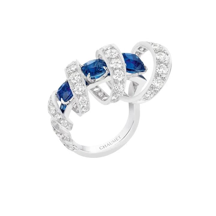 Torsade de Chaumet戒指,白金镶嵌3颗枕形切割斯里兰卡蓝宝石蓝宝石(分别重2.12克拉、1.41克拉和0.84克拉)、狭长方形切割、玫瑰式切割和明亮式切割钻石/Chaumet。