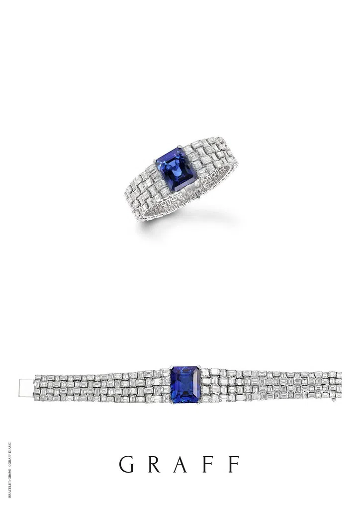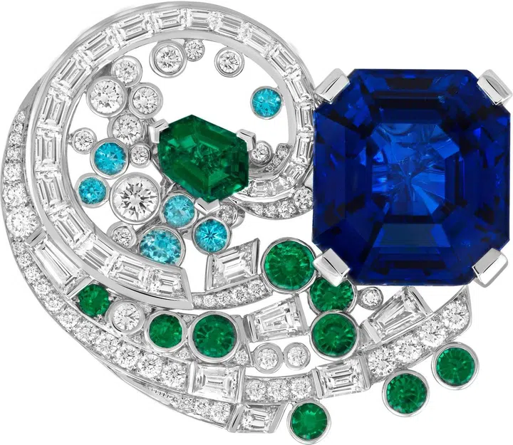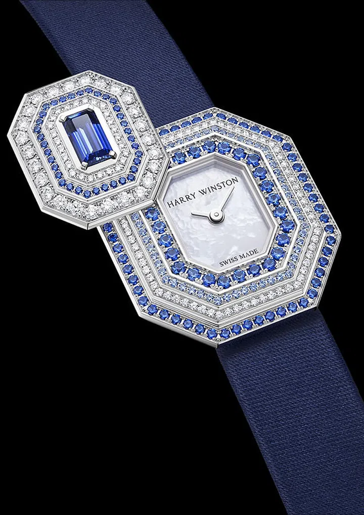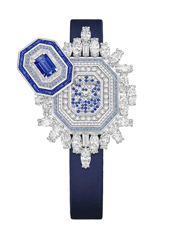 Ultimate Emerald Signature腕表,可作为胸针或坠饰佩戴,18K白金镶嵌106颗圆形明亮式切工浅色蓝宝石、86颗圆形明亮式切工钻石、24颗榄尖形切工钻石、22长形切工深色蓝宝石、16颗长形切工钻石和1 颗祖母绿型切工蓝宝石/Harry Winston。
