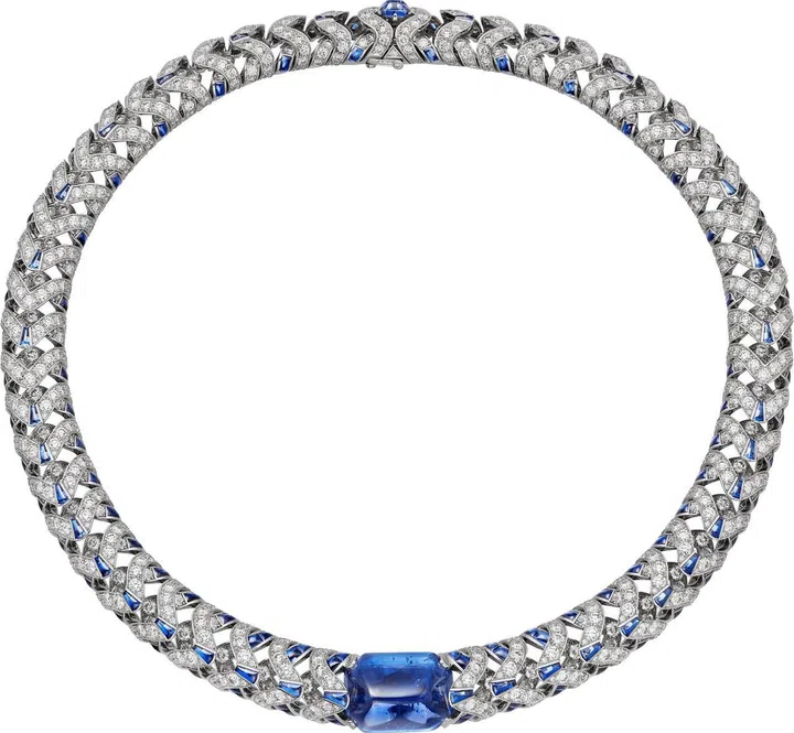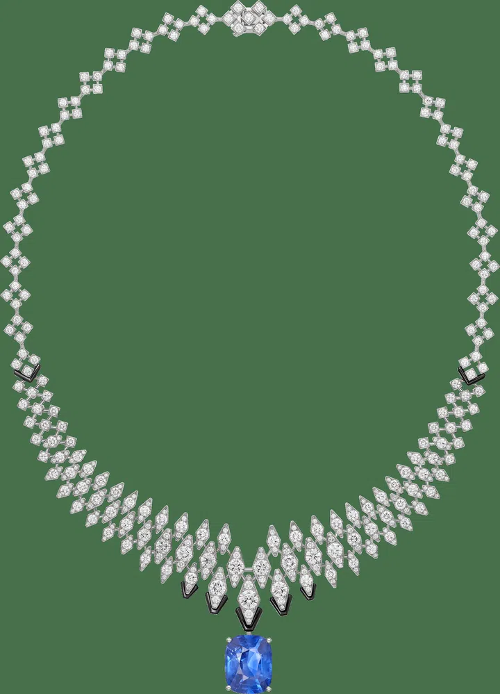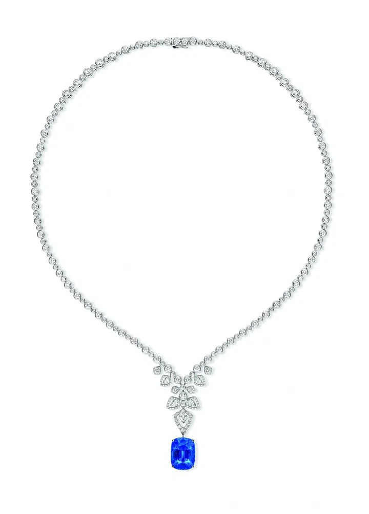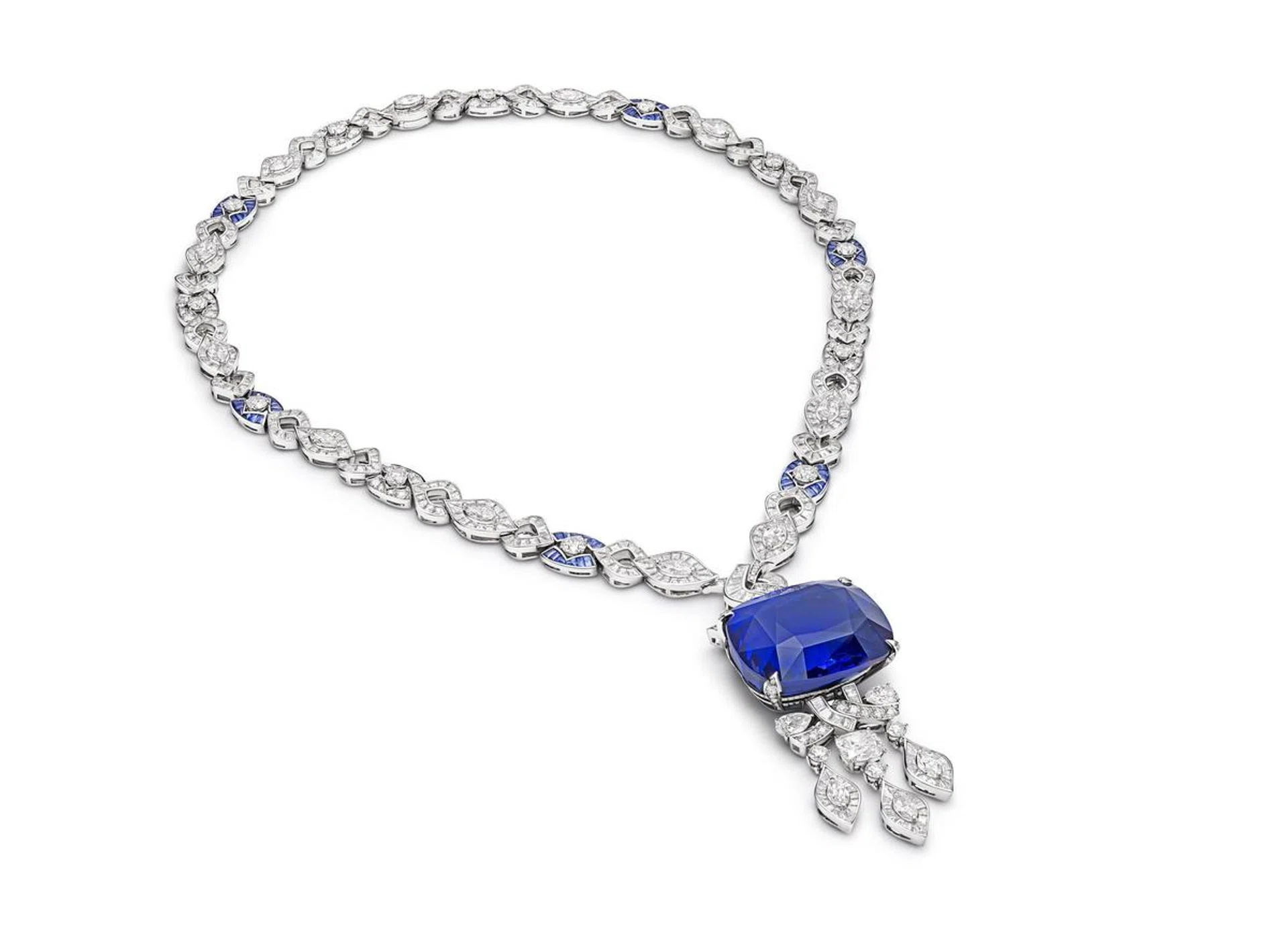 Mediterranean Reverie高级珠宝项链,铂金镶嵌一颗皇家蓝枕形蓝宝石(产自斯里兰卡,重107.15克拉)、一颗1.27克拉枕形钻石、72颗弧圆形切割蓝宝石(共重3.98克拉)、487花式切割钻石(共重20.30克拉)、16颗马眼形钻石(共重5.91克拉)、2颗梨形钻石(共重1.01克拉)、15颗圆形明亮式切割钻石和密镶钻(共重6.80克拉)/Bvlgari。