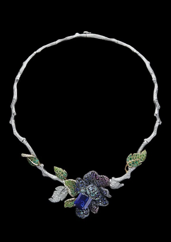 Dior Rose高级珠宝系列项链,白金和黄金镶嵌钻石、蓝色和紫色蓝宝石、沙弗莱石、祖母绿、紫牙乌和翠榴石、紫水晶和帕拉依巴碧玺/Dior。