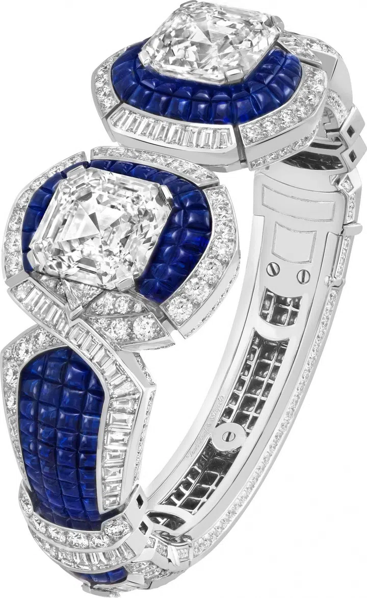 Entrelacs Mystérieux手镯,白金和玫瑰金,两颗阿斯切切工钻石(各重10.88克拉),Traditional Mystery Set传统顶部抛光隐密式镶嵌凸圆形切割蓝宝石,钻石//Van Cleef & Arpels。