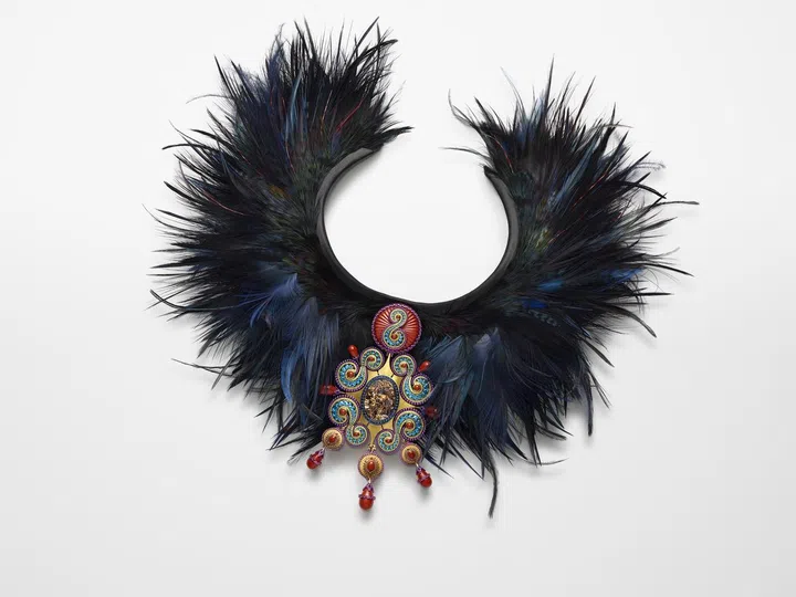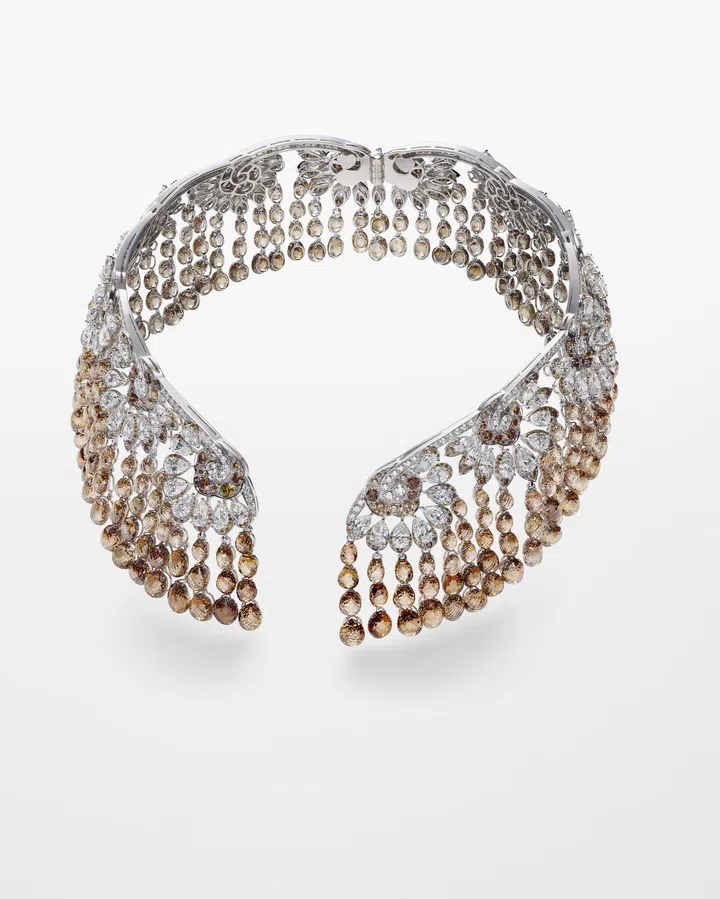 24克拉黄金和钛项链,搭配24K黄金浮雕,镶嵌红色碧玉、凸面形蓝色磷灰石(总共11.6克拉)、凸面形紫色石榴石(总共3.4克拉)、3.1克拉圆形黄色蓝宝石、3.1克拉圆形石榴石和圆形黑色钻。 公鸡、灰鹭、鸵鸟和黑雉羽毛。