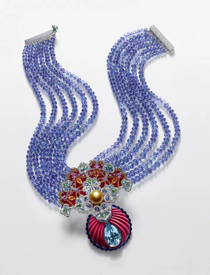 18K白金和钛金属项链,由共459克拉的坦桑石珠组成,镶嵌12.4克拉梨形海蓝宝石、一颗12.7克拉黄金珍珠、梨形海蓝宝石、梨形坦桑石、梨形沙弗莱石、明亮式切割和榄尖形切割粉色蓝宝石、明亮式切割石榴石、明亮式切割和榄尖形切割钻石和明亮式切割黄色蓝宝石。