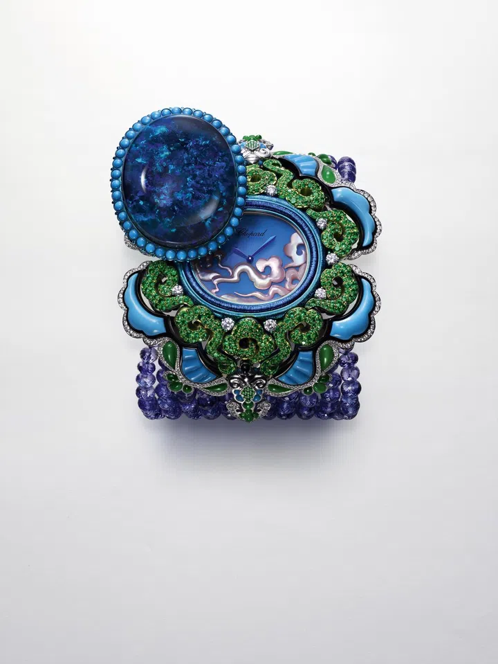 18K白金和钛金属神秘腕表,镶嵌72克拉黑色蛋白石、雕琢翡翠、绿松石、缟玛瑙、梨形和明亮式切割钻石、明亮式切割祖母绿和明亮式切割坦桑石。表盘镶嵌粉色珍珠母贝和玉髓。表带由共235克拉的坦桑石珠组成。