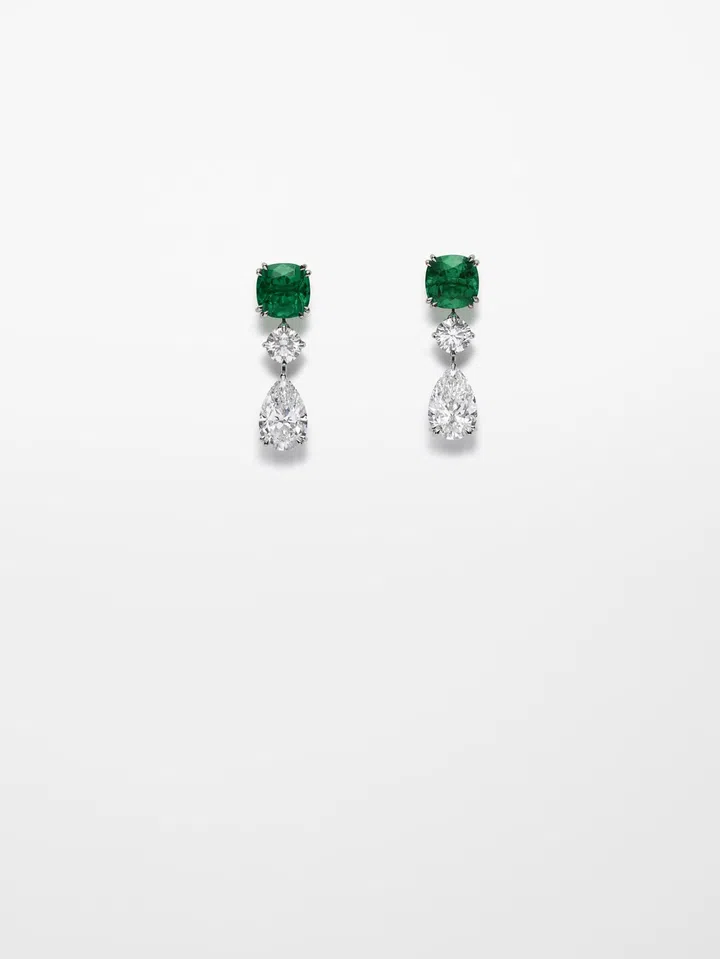 铂金项链,镶嵌17颗共52克拉的独特无油枕形切割祖母绿、一颗25克拉D色无瑕梨形钻石,以及两颗分别重8.3克拉和29.6克拉的D色无瑕圆形钻石。