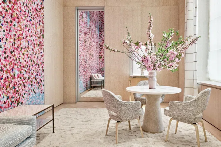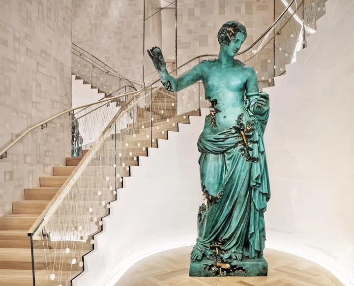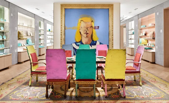 步入全新旗舰店,开阔的珠宝陈列区在模拟日光的顶灯装置映照下分外明亮瞩目。这一新颖的顶灯装置几乎横跨首层天花板,其独特的切面设计不仅充满现代抽象之美,更巧妙致敬蒂芙尼的悠久传承与钻石权威的翘楚地位。除了华美璀璨的珠宝,还有近40件艺术品遍布全新旗舰店的10层空间,其中不乏与知名艺术家携手打造的特别作品。从达明安·赫斯特(Damien Hirst)、朱利安·施纳贝尔(Julian Schnabel)、拉希德·约翰逊(Rashid Johnson),到安娜·韦扬特(Anna Weyant)与丹尼尔·阿尔轩(DanielArsham),堪称无与伦比的艺术盛宴。