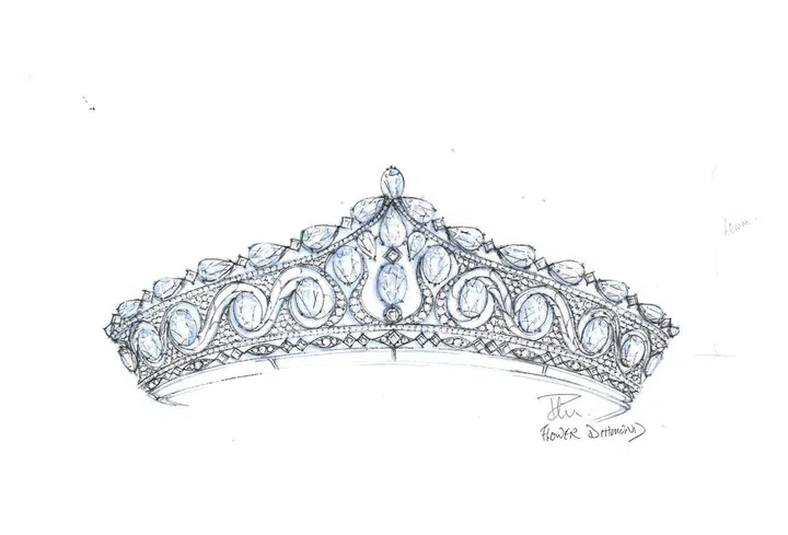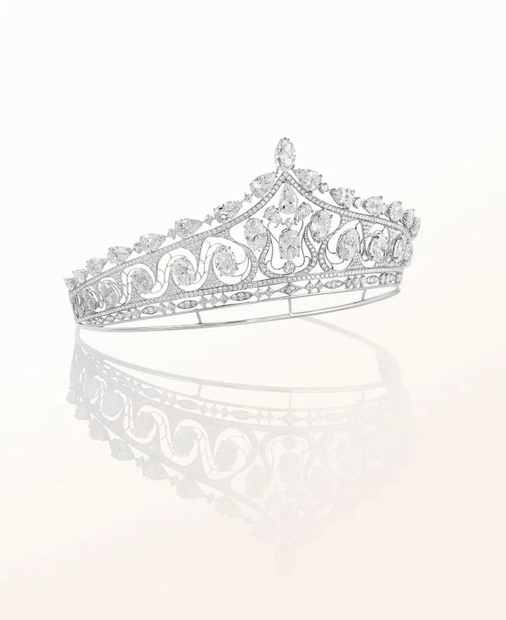 这顶皇冠从设计、制作到成品历时8个月,由838颗钻石组成,包括38颗方形、14颗椭圆形、19颗梨形和767颗圆形切割的钻石,总重超过132克拉,象征着传统与现代风格的完美融合。在制作过程中,挑战之一是寻找不同尺寸的钻石,确保它们在形状和质量上匹配,彰显了这顶头饰的独特性与精细工艺。