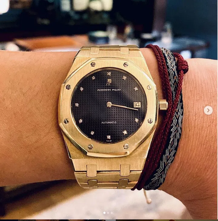 蔡诗芸送给王阳明的表款来自爱彼(Audemars Piguet)Royal Oak系列的5402ba古董腕表。低调闪耀的钻石面盘,贵气的金黄色链带,让人目眩神迷。今年10月西洋乐坛小天王Justin Bieber与名模Hailey Bieber结婚时,他送给自己的结婚礼物也是类似的同款腕表。(照片/@sunnyboyyy)