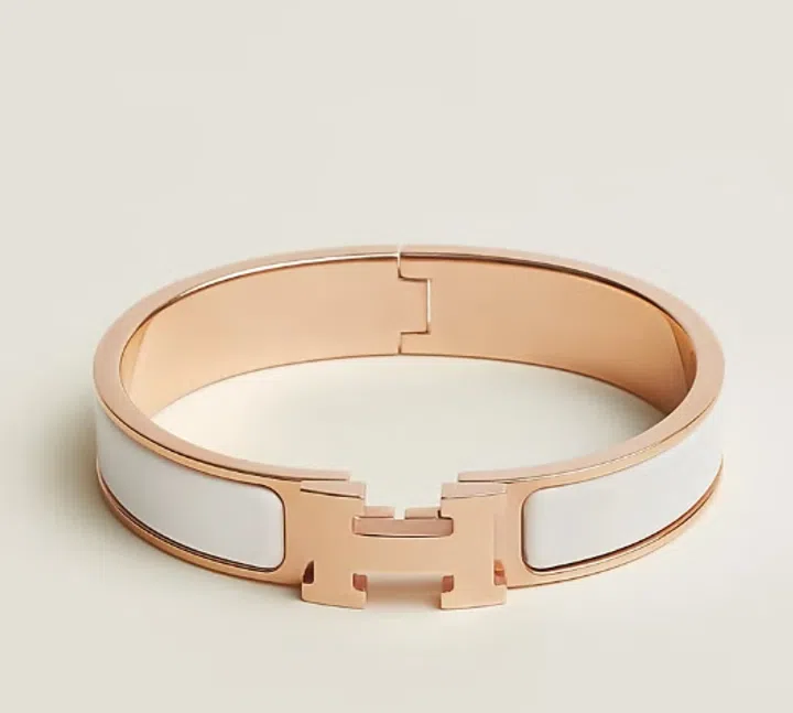 极具辨识度的爱马仕(Hermes)Clic H手镯,也是崔美娜秀的pick!品牌首字母“H”化为可以开合的扣环,并以金属搭配彩色珐瑯做组合。除了经典的黑白两色之外,也推出风格各异、特色鲜明的颜色,为造型增添时尚趣味。