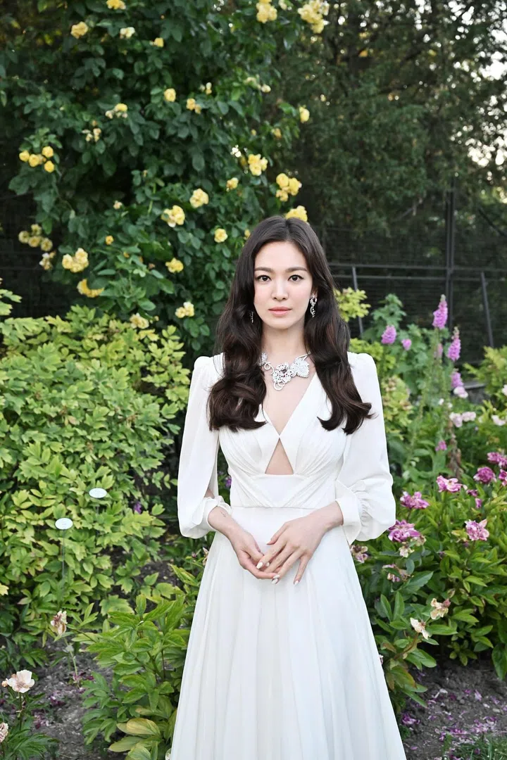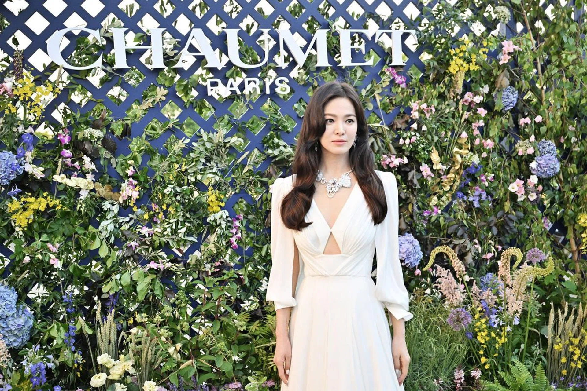 尚美巴黎代言人、韩国女演员宋慧乔与来自LE JARDIN DE 尚美巴黎游园漫步高定珠宝套系丰饶梦田篇章的Feuille de Vigne翠蔓缘篱主题项链相伴,项链上镶嵌有一颗重达5.18克拉的莫桑比克红宝石,与巧妙搭配的同款耳环相映成趣,尽展动人风韵。