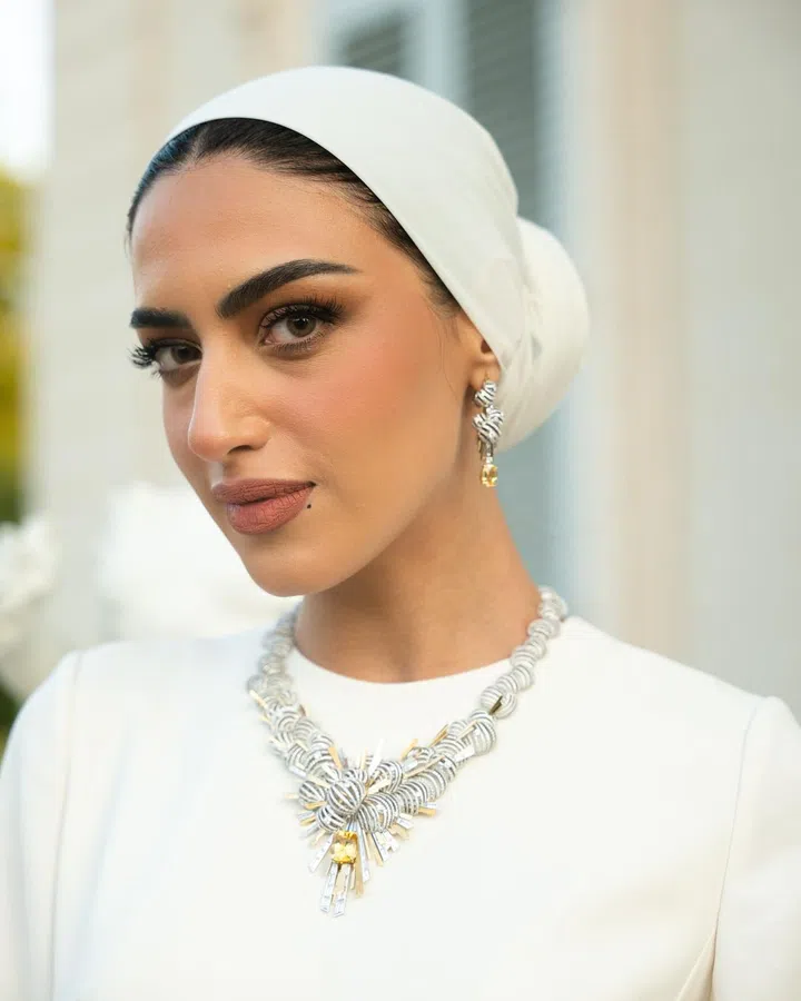 尚美巴黎世家挚友、沙特阿拉伯企业家Yara Al Namlah,与Les Ciels de 尚美巴黎天穹皓境高定珠宝套系Nuages d'or銮光漫云主题项链以及同款耳环相伴,举手投足尽显典雅沉稳。