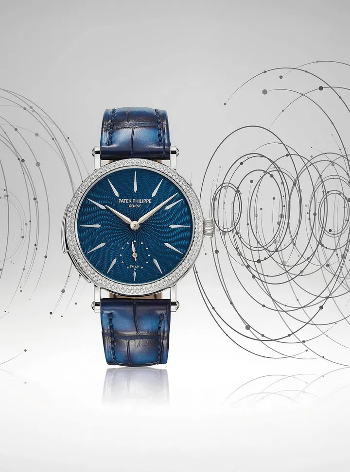 百达翡丽(Patek Philippe)白金款女式三问报时腕表Ref.7040/250G的36毫米白金表壳厚度仅为10.14毫米,表耳线条延续纤细优雅的气息。表圈采用独家“火光镶嵌”(Flamme)工艺,镶饰两圈共168颗明亮切割钻石。表盘首次采用透明珐琅(flinqué)工艺装饰——雕刻师手工雕刻出充满韵律的螺旋纹理,抛光后再覆盖烧制蓝色珐琅层,在光线下呈现漩涡形的生动光效。搭载 Caliber R 27 PS自动上链机芯,提供最多48小时动力储备。透过蓝宝石水晶表底可看到音锤、音簧的运作,以及Calatrava十字架形状的镂空桥板。按下表壳侧面9点的滑钮即可启动三问报时