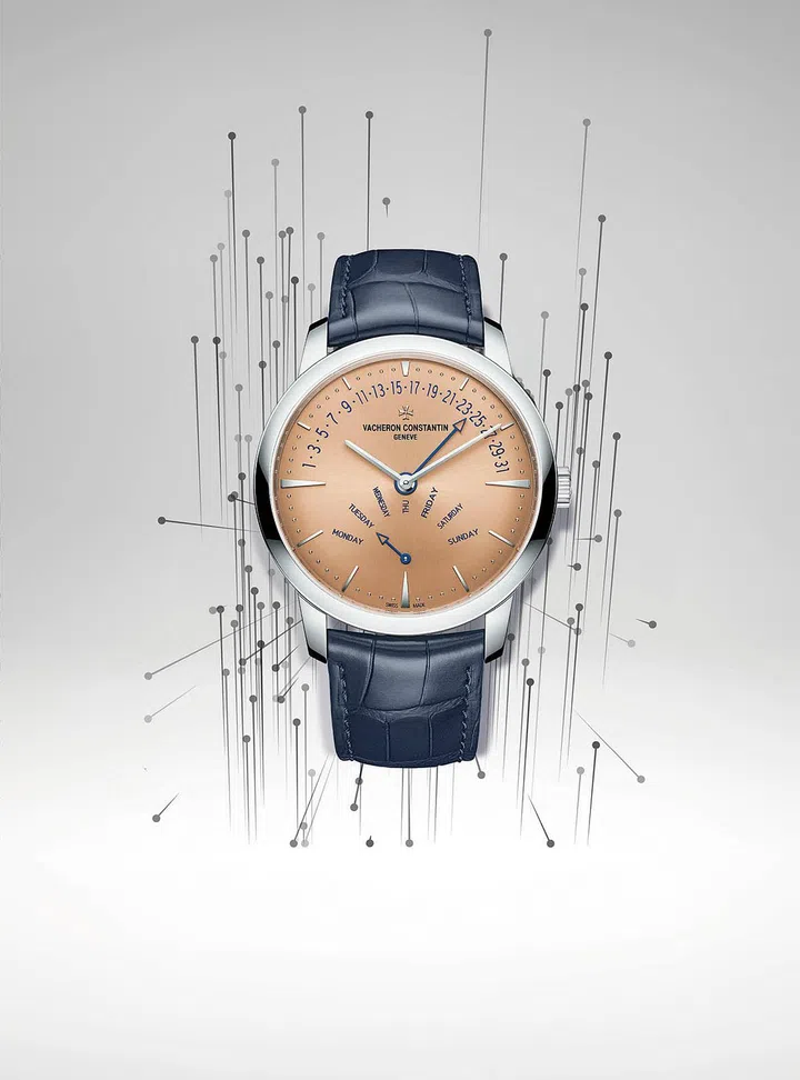江诗丹顿(Vacheron Constantin)Patrimony传承系列双飞返星期日历型腕表以铂金打造,三文鱼色表盘的上半部分是逆跳日期显示,1和31号刚好分别在9点和3点时刻之上,以近乎180度的特大幅度构成十分理想的弧形占据表盘的一半空间。至于表盘的下半部分,是同样为逆跳设计的星期显示。由于指针的轴心就在6点刻度的上方,加上中央指针的轴心所限,逆跳星期显示的幅度相对逆跳日期细得多,指针也相对地短小。就因为两者逆跳的幅度不一样,两者指针逆跳的时机也有分别,一个是月尾转月头才跳,另一个是星期日转星期一跳,两支指针的动作所构成的动态,为腕表增添独特的视觉美感。
