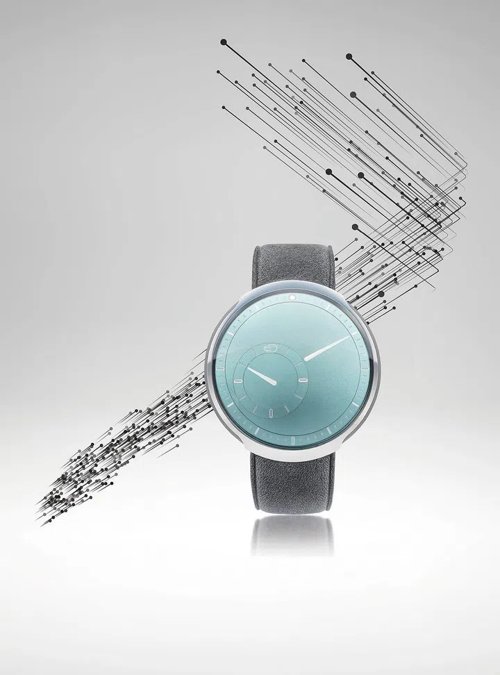 独立品牌Ressence的新表款“Type 8 Sage Green”跳脱传统,融合了极简主义和流线型设计理念,带给人一种新鲜感和独特的美感。腕表延续品牌标志性的轨道式表盘系统,分钟刻度圈环绕在表盘最外侧,中央的长指针为分针,小表盘则指示小时,其中小表盘12点位置还印有品牌标志。整体设计风格干净简洁,搭配清新的浅绿色。表壳和底盖采用5级钛金属材质打造,表镜呈弧形凸起,显得更加圆润。在腕表上看不到表冠,这也是Ressence一贯的设计风格,通过旋转底盖,即可为腕表上链,调校时间和日期。