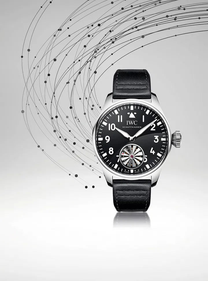 IWC万国表大型飞行员Markus Bühler陀飞轮腕表43,是2008年大型飞行员腕表“Markus Buhler”特别版的复刻版,直径43mm的表壳以铂金打造,黑色漆面表盘上压印白色数字,搭配覆以Super-LumiNova夜光涂料的镶贴时标。视线移至6点位置,即可见融合飞机涡轮的陀飞轮装置。采用轻量钛合金加工制成的涡轮部件,形状复杂且尺寸极小,光是铣削过程就要好几个小时,因此在加工后,12个微小叶片须经过手工抛光,再进行钜细靡遗的表面修饰。为了避免涡轮给装置增加额外的重量,Markus Bühler把涡轮变成陀飞轮框架的上半部,取代调节器。如此一来,表盘上的焦点便多了一项技术功能——游丝连接到其中一个叶片的底部,制表师可以透过转动涡轮来调整摆轮的过零点位置。