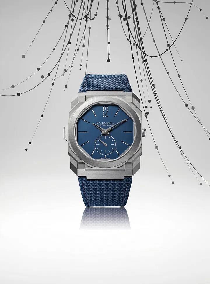 作为市面上最纤薄的报时表,宝格丽(Bulgari)Octo Finissimo Minute Repeater超薄三问腕表集结令人惊艳的复杂度与纤薄度(机芯3.12毫米、表壳6.85毫米),推出后即凭藉现代又精致的设计大放异彩。精选超轻量钛金属打造的八角形表壳,表径40毫米。雾面蓝色表盘搭配小秒针盘设计,精密编排的镂空时标则放大了钛金属传导声音的优异特性。内敛低调且富现代感的腕表搭载品牌自制BVL 362手动上链机芯,驱动时、分、小秒针及三问报时功能。