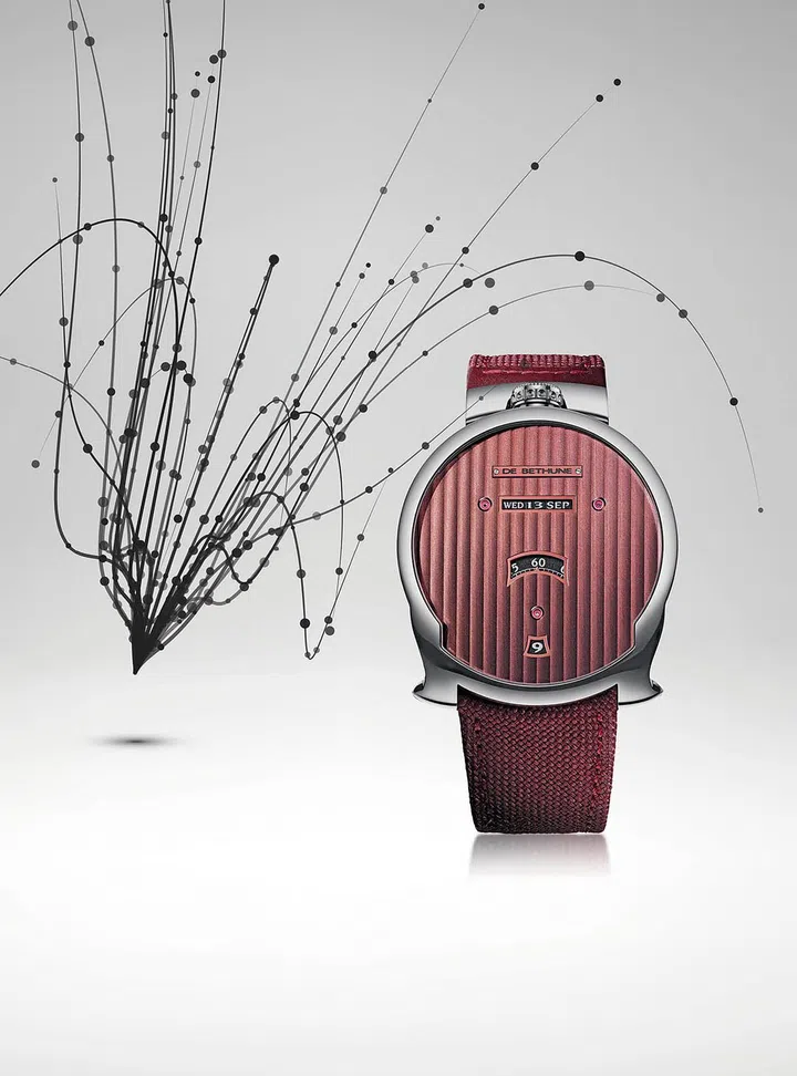 De Bethune DBD “Season 2”腕表低调的美学所暗示的正是其背后复杂的机制。内部配置了五个圆盘,12点钟位置透过并排的视窗展示星期、日期和月份,在下方的则依次是滚动分钟和跳动小时。除了令人印象深刻的机芯,最大的创新就是在表盘上饰以日内瓦条纹。由于蓝宝石水晶的双重防眩处理,透过背面可以清晰的看到所有De Bethune最新的技术所带来的卓越工艺。这款表搭载的是振频为每小时2万8800次的手动机械机芯Calibre 2044,配置了最新内嵌白金的钛金属摆轮,以及三重降落伞减震系统。
