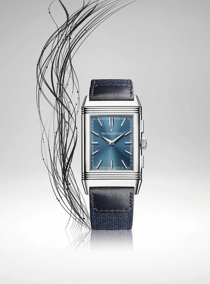 翻转之间,正反皆艺。积家(Jaeger-LeCoultre) Reverso Tribute Chronograph翻转系列计时腕表,以计时码表这一经典运动复杂功能致敬翻转腕表系列原型设计的运动渊源。创新“原子层沉积”工艺的运用,造就正面表盘优雅沉稳的蓝灰色泽,翻转表壳,背面表盘完全镂空,让精工细制的机械装置一览无余。内载全新860型手动上链一体式计时机芯,兼具逆跳计时与双重时间显示,于不足12毫米的超薄表壳中,优美上演动感奇观。