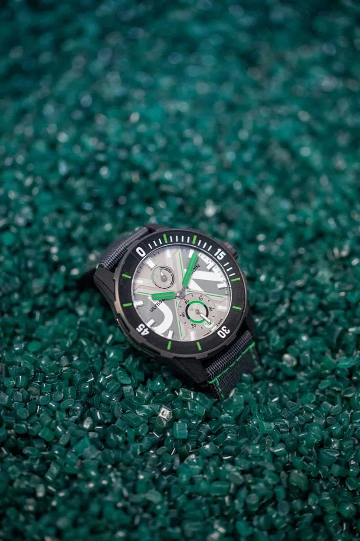 在研发过程中,雅典表的创新部门评估并测试了多个解决方案,今后可能推广应用于其他产品中。作为大自然的象征,绿色元素在腕表中处处可见——从表盘、表圈、表冠保护装置,到再生PET材质表带上的缝线,为腕表注入了鲜活的生机。