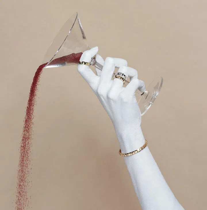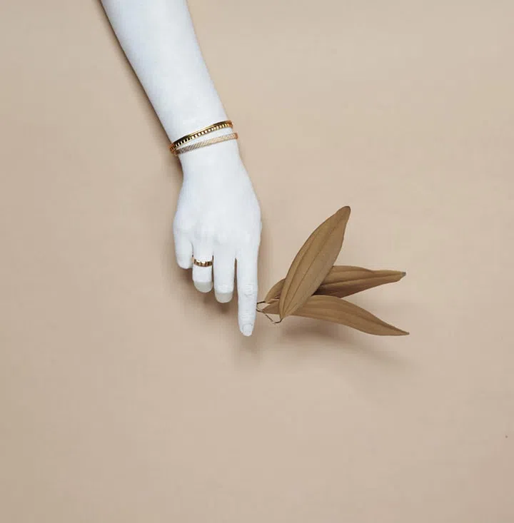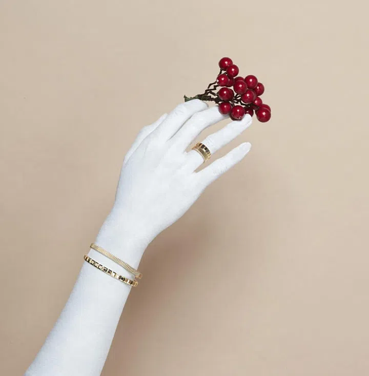 上至下:Quatre Clou de Paris巴黎饰纹黄金戒指;Quatre Grosgrain罗缎直线刻纹黄金戒指;Quatre Grosgrain罗缎直线刻纹黄金手镯;Quatre Clou de Paris巴黎饰纹黄金手镯。