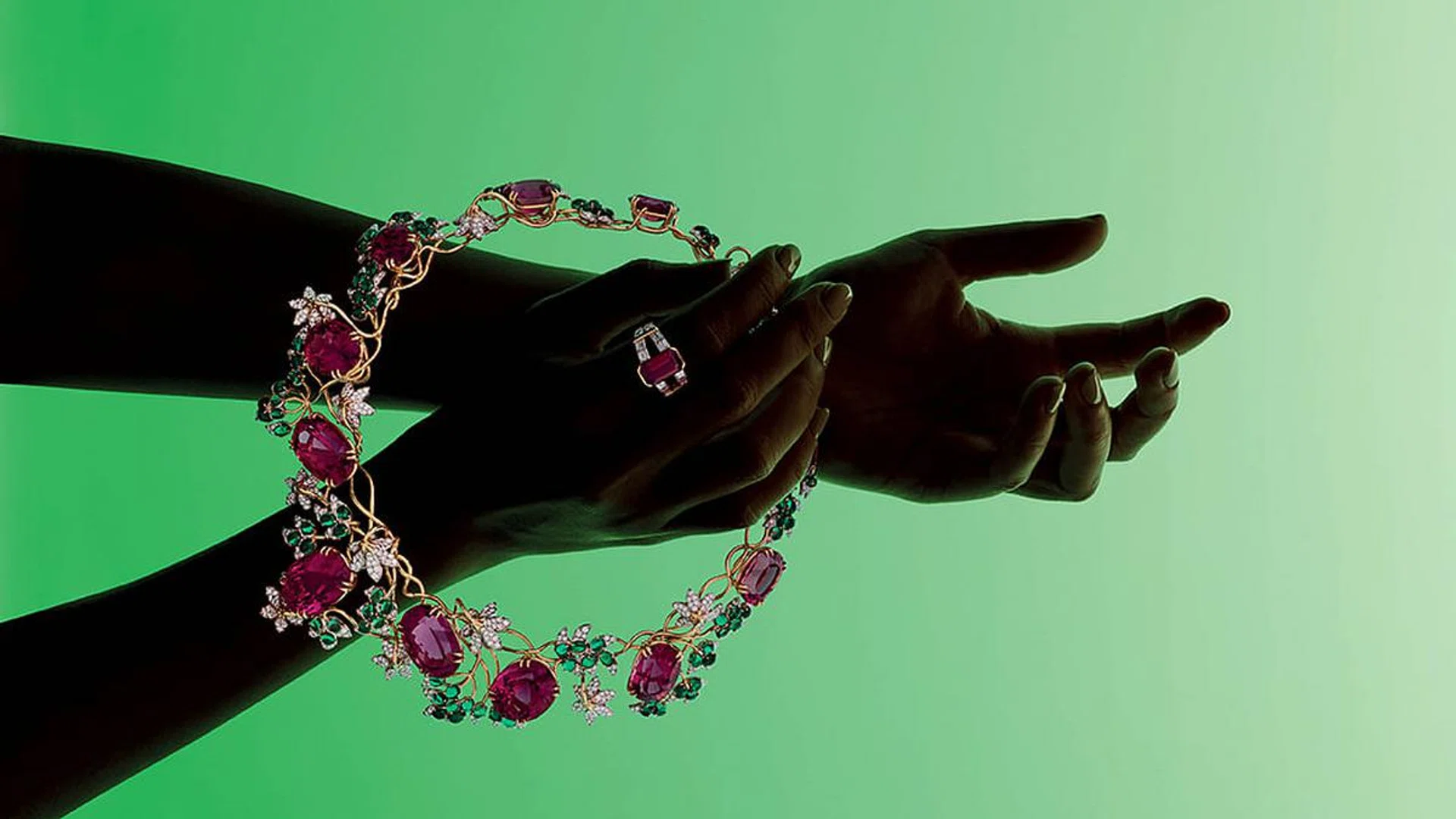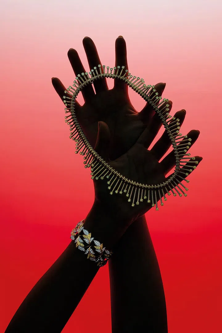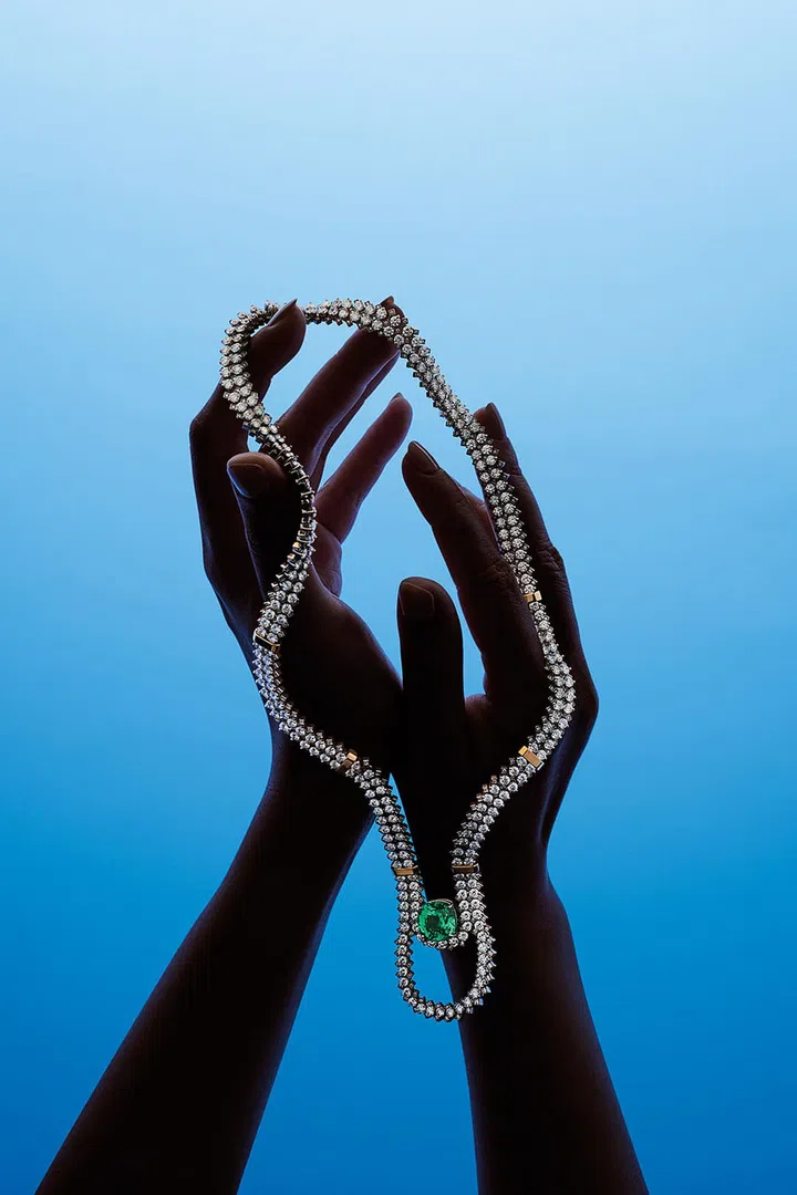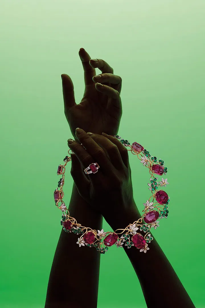 精表珠宝万千瑰丽自然万物在蒂芙尼(Tiffany & Co.)高级珠宝中变得天马行空,品牌将珍贵宝石化为不凡之作,以全新视角展开色彩与宝石的生动对话,让传承百年的风格魅力夺目绽放。文 / 张思嘉 / 16 Mar 2023blue book collection, Blue Book High Jewellery Collection, High Jewellery, jewellery, Tiffany & Co.Share this articlePhotography: Phyllicia WangArt direction: Eric Choon1/4Schlumberger Chevron Fringe黄金镶钻项链; Schlumberger Marquetry铂金和黄金镶嵌白钻和黄钻手镯/Tiffany & Co.。2/4高级珠宝戒指,铂金和黄金镶嵌红宝石和钻石; Schlumberger Vigne项链,铂金和黄金镶嵌碧玺、祖母绿和钻石/Tiffany & Co.。3/4高级珠宝项链,铂金镶嵌坦桑石、蓝玉髓、蓝宝石和钻石;高级珠宝耳环,白金镶嵌蓝玉髓、乳白晶、蓝宝石和钻石/Tiffany & Co.。4/4高级珠宝项链,铂金和黄金镶嵌绿色铜辉钠锂碧玺和钻石/Tiffany & Co.。blue book collection, Blue Book High Jewellery Collection, High Jewellery, jewellery, Tiffany & Co.Share this article