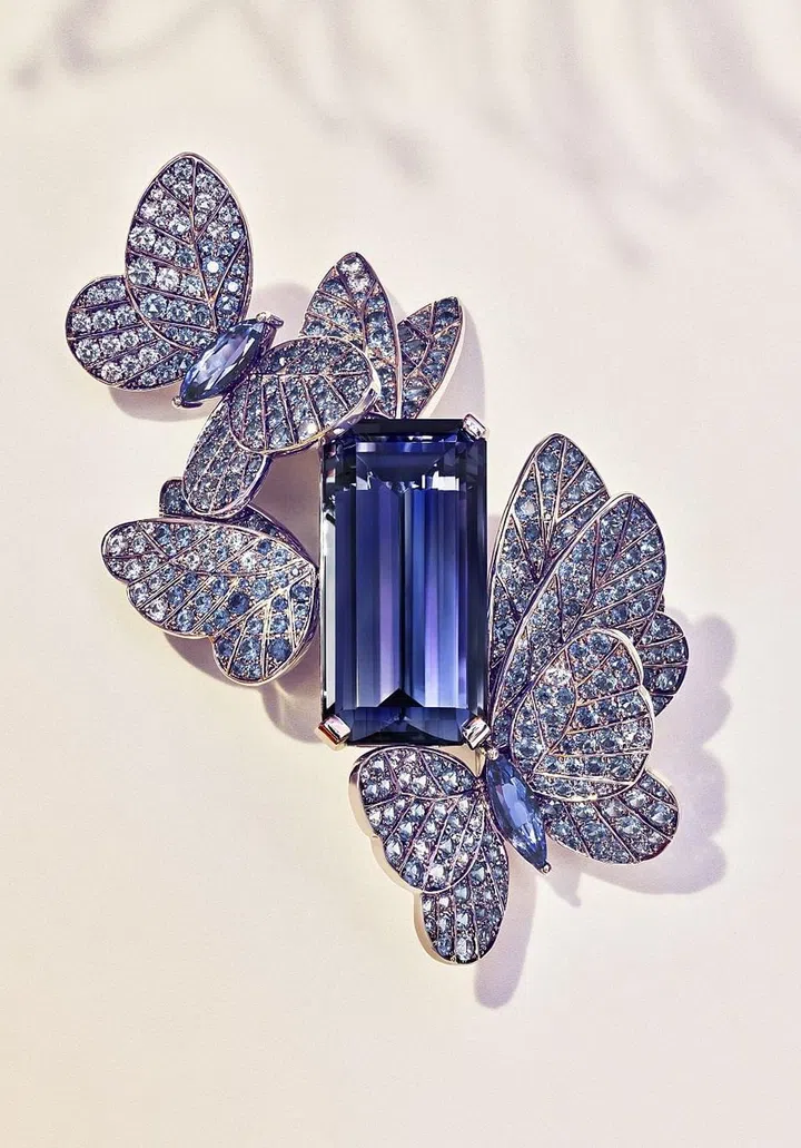 铂金镶嵌祖母绿形切割坦桑石、圆形和榄尖形蓝宝石及钻石蝴蝶造型胸针