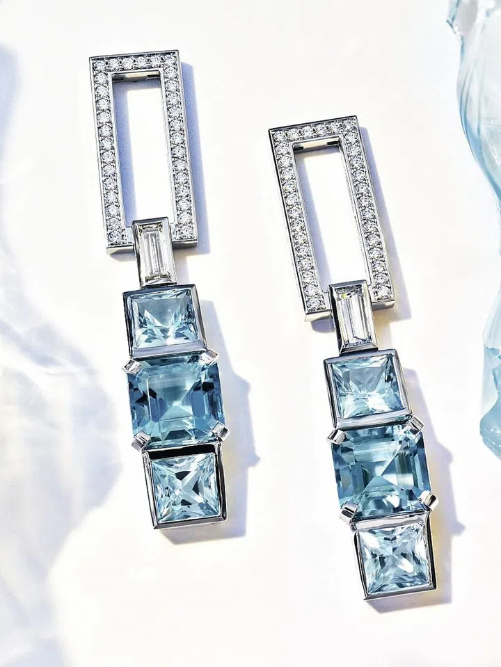 铂金镶嵌祖母绿形切割海蓝宝石、圆形明亮式及狭长形钻石耳环
