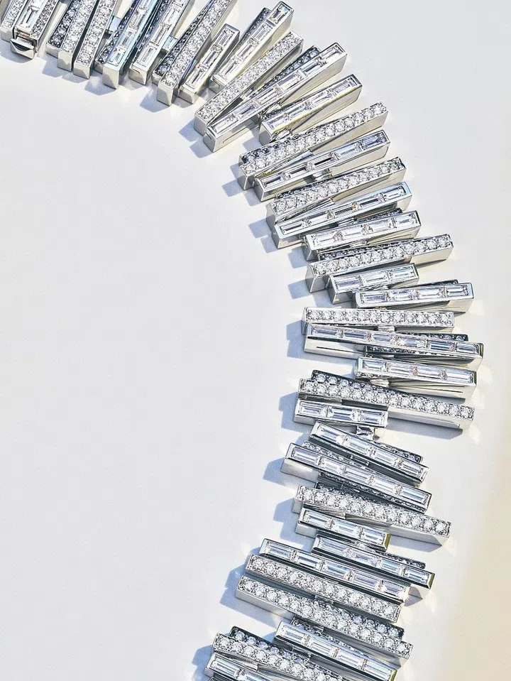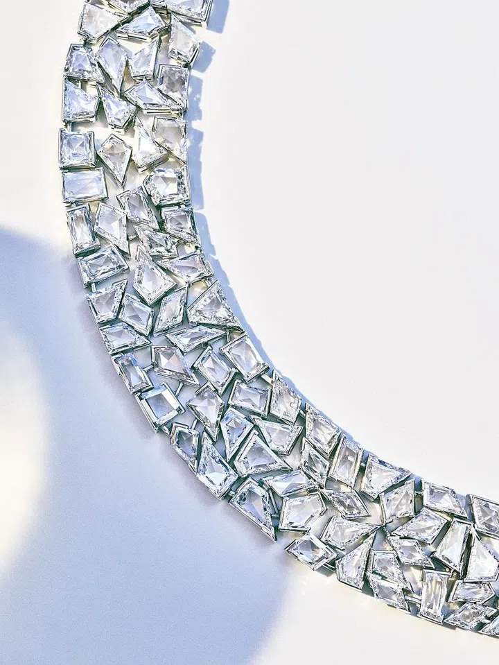生命的轮回,四季的更迭,大自然造物的神奇,总是让人惊呼不已。四季是大自然的序曲,银装素裹的冬季是主旋律,凝若冰霜,如梦似幻。在冬季主题作品中,蒂芙尼前所未有地采用“冰”作为系列灵感,经验丰富的蒂芙尼工匠研习不规则的美感,巧妙地运用于钻石的切割工艺之中。每一颗钻石都被切割成层次不同的独特形状,呈现冰的形态,宛若漂浮在铂金海洋之上的一座冰山,恢弘而壮丽。