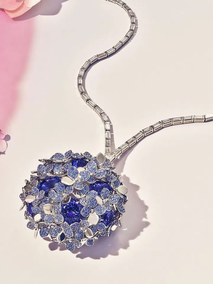 铂金镶嵌圆形和椭圆形坦桑石、圆形蓝宝石以及长方形和定制切割钻石绣球花造型项链