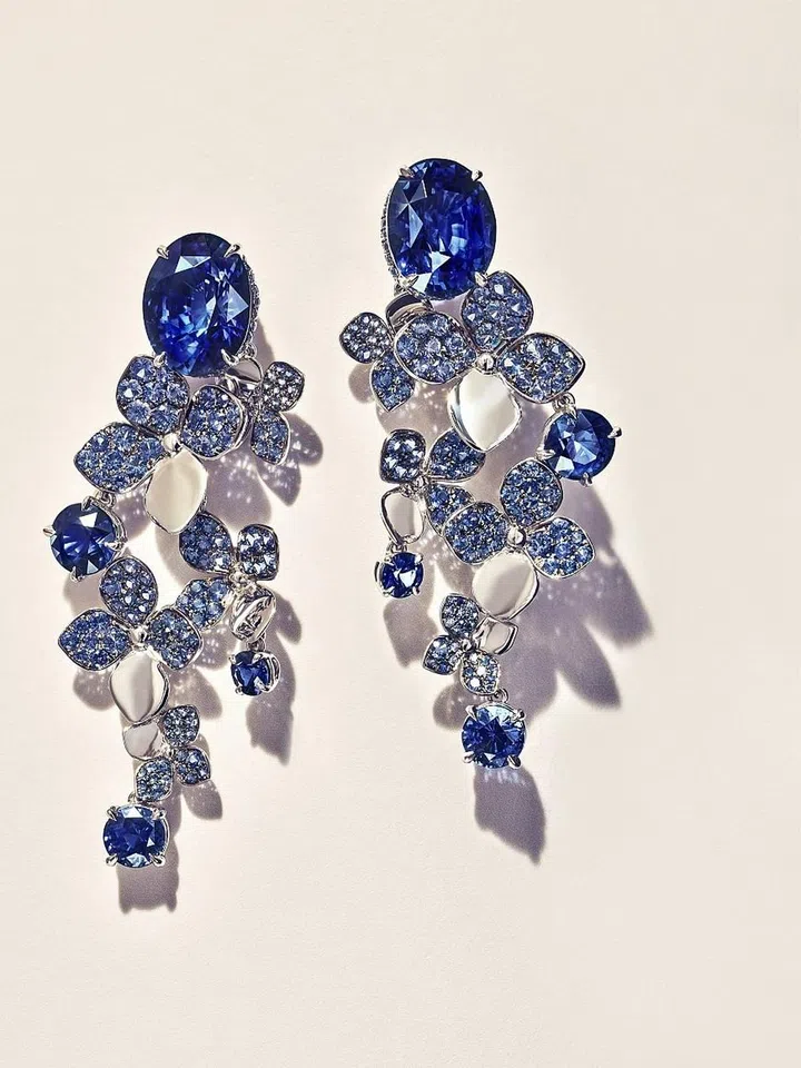 铂金镶嵌椭圆形蓝色蓝宝石、圆形蓝宝石及正方形蓝宝石绣球花造型耳环