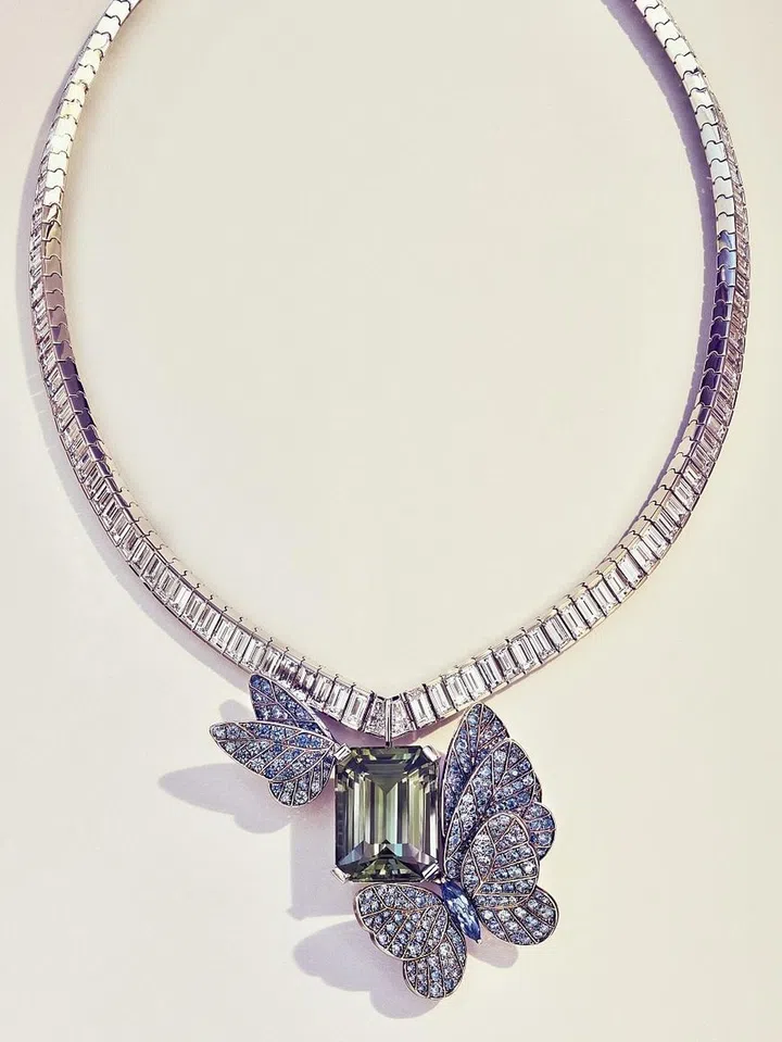 铂金镶嵌祖母绿形切割三色黝帘石(超过23克拉),长棍形、半阶梯形及圆形钻石,和圆形及榄尖形蓝宝石蝴蝶造型项链