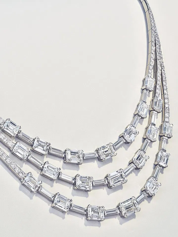 铂金镶嵌祖母绿形、长棍形及圆形明亮式切割钻石项链(钻石总计43.59克拉)